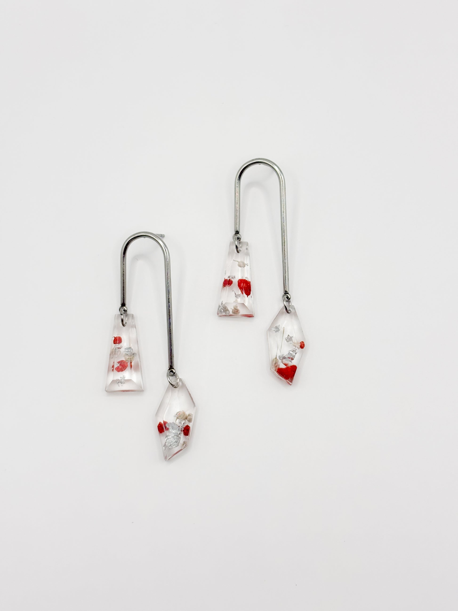 The Mon Chéri Asymmetric Arch Drop Earrings feature sleek stainless steel arches designed to sit differently on each ear for a modern, intentional imbalance. On the longer arch, a faceted resin pendant hangs vertically, catching the light through subtle silver leaf and real flowers in deep red and soft pink tones. The shorter arch is finished with a smooth, tapered pendant that creates contrast in both shape and movement. Finished with silver hardware, these earrings frame the face with an architectural yet feminine line, designed as a confident expression of self devotion and individuality.