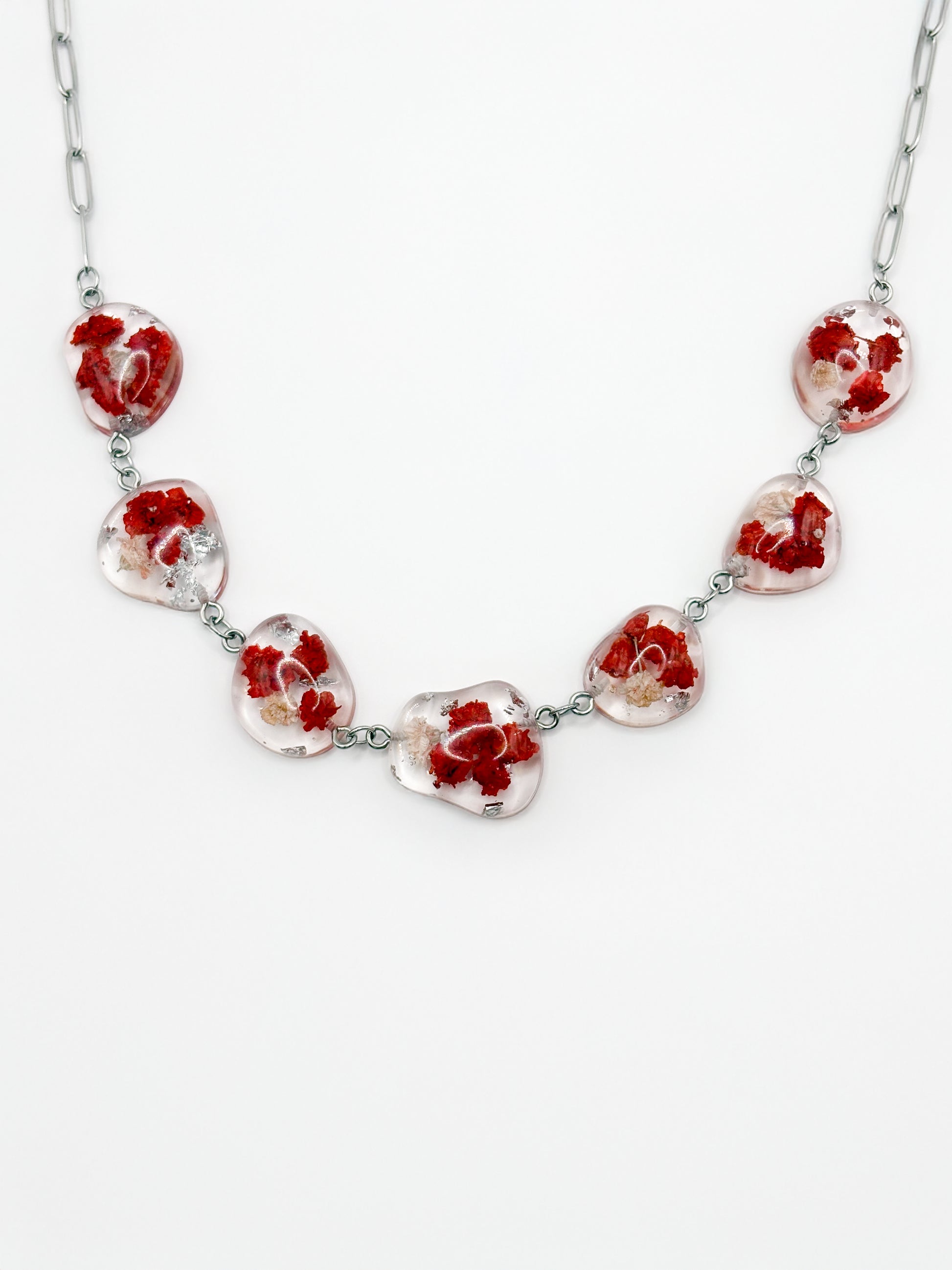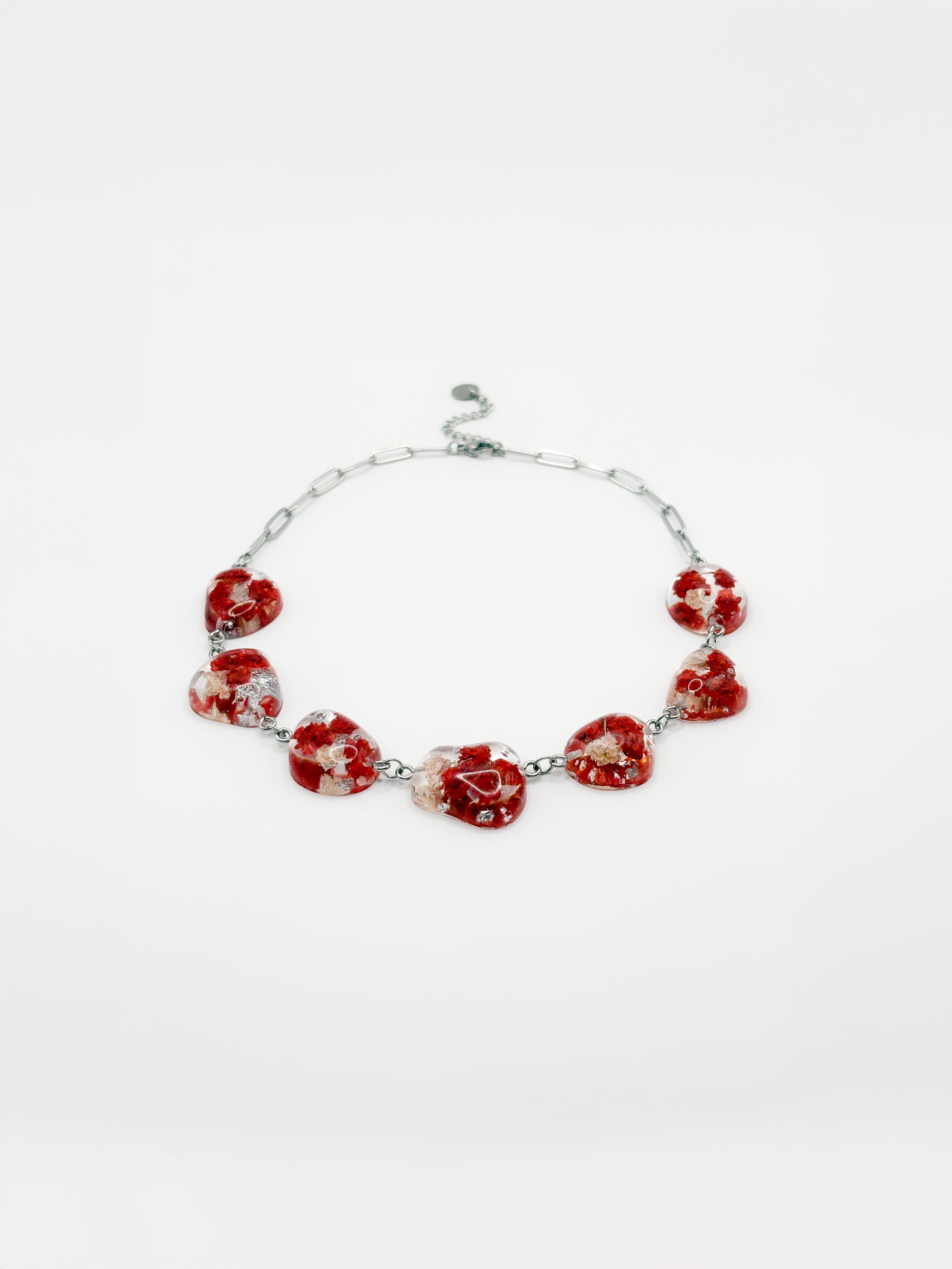 De Mon Chéri Pebble Necklace is een opvallende statementketting gemaakt van grote, gladde harsstenen, elk met echte bloemen in dieprode en zachtroze tinten en subtiele zilveren vlokjes erin. De stenen zijn verbonden met gepolijste zilveren details en aan de achterkant afgewerkt met een grove paperclipketting, waardoor de ketting comfortabel om de nek zit en tegelijkertijd een moderne uitstraling geeft. Gestructureerd maar toch vloeiend, rust dit sieraad zichtbaar op het sleutelbeen en voelt expressief aan zonder zwaar te zijn. Het is ontworpen als een krachtige herinnering dat zelfliefde een plek verdient.