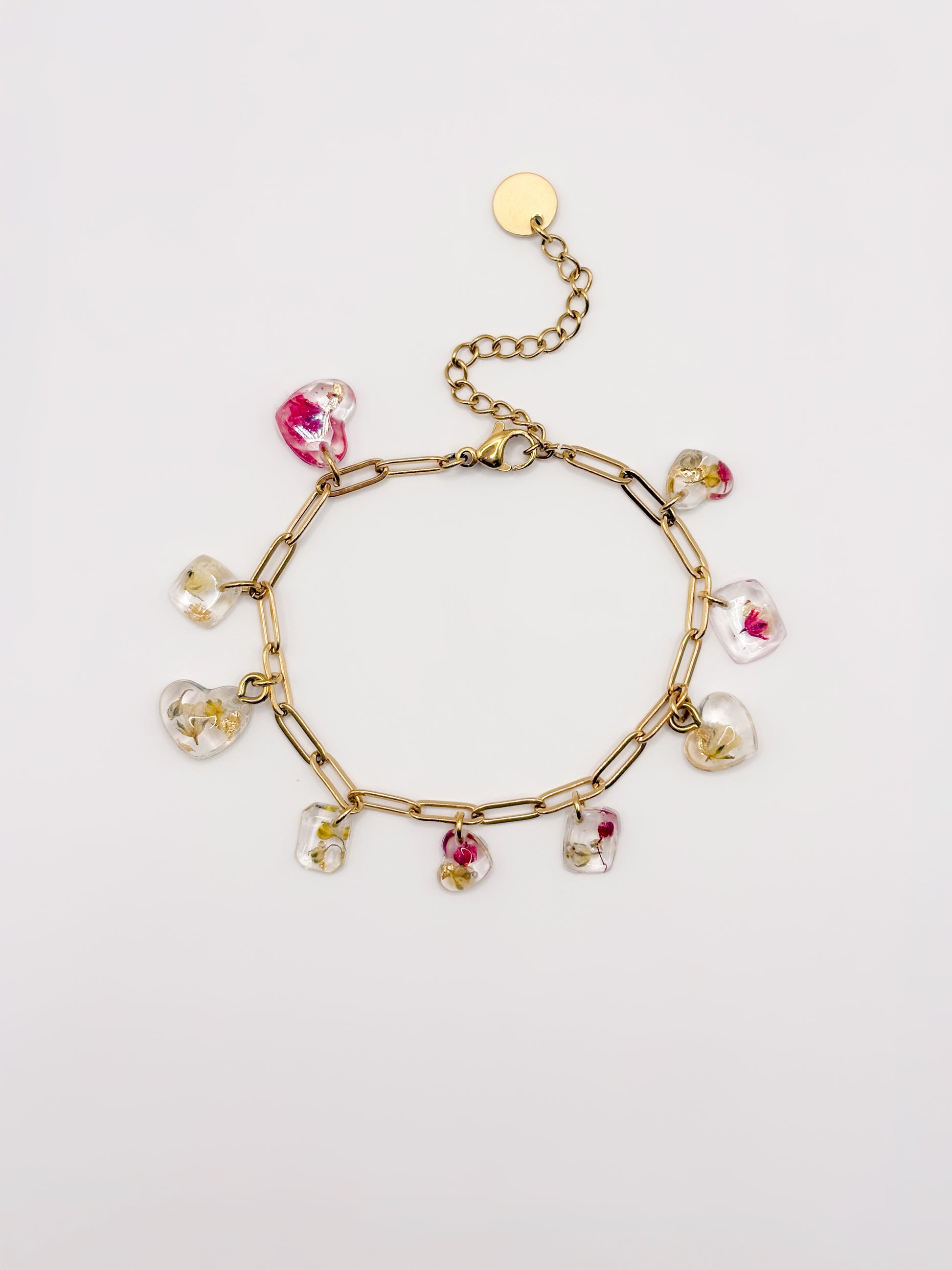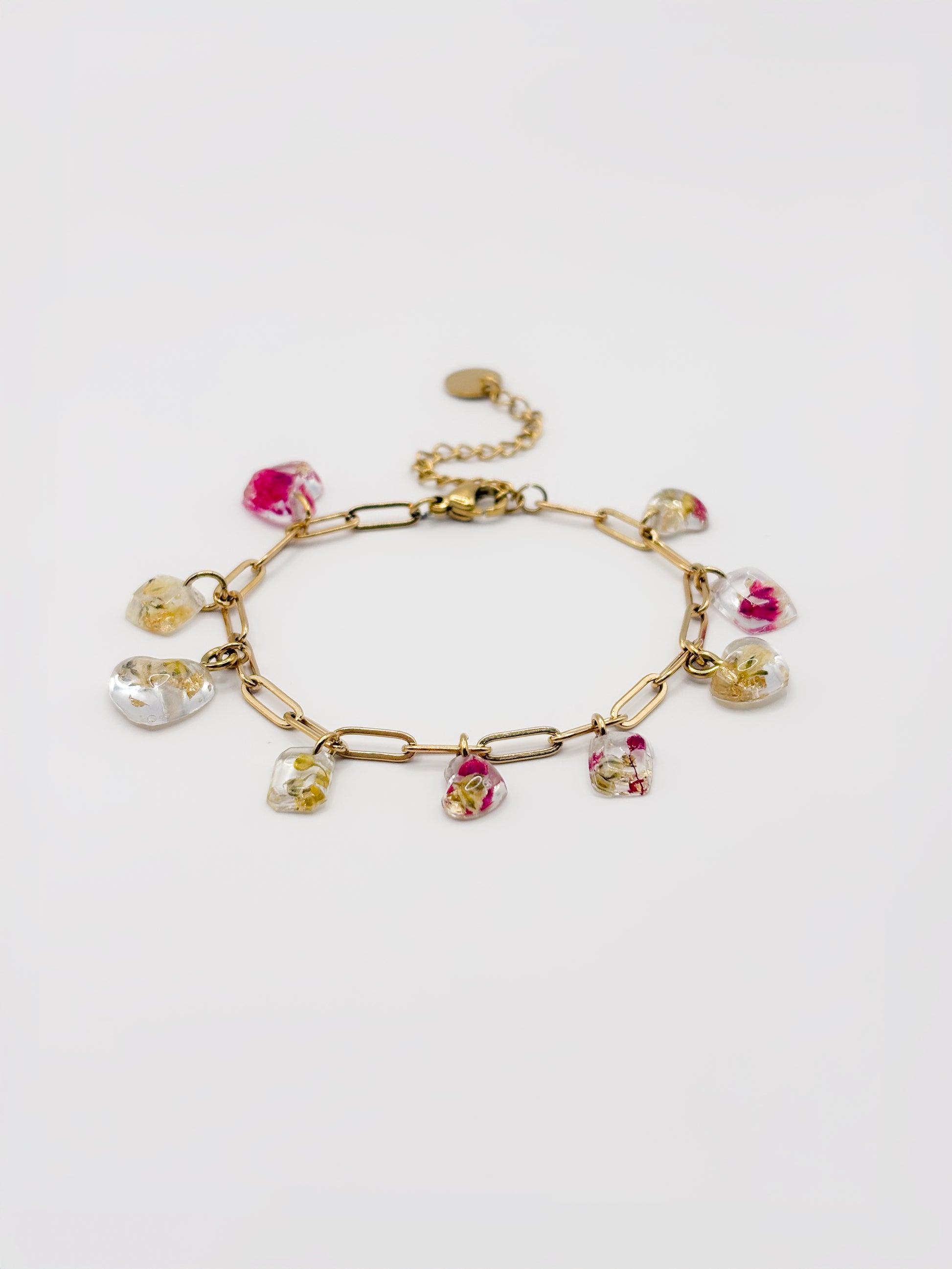 Finished with 18K gold plated PVD stainless steel hardware and soft hints of gold leaf, this one-of-a-kind bracelet feels both fresh and refined. Its dainty design makes it perfect for everyday wear, while still bringing a unique, vibrant touch to your jewelry collection.