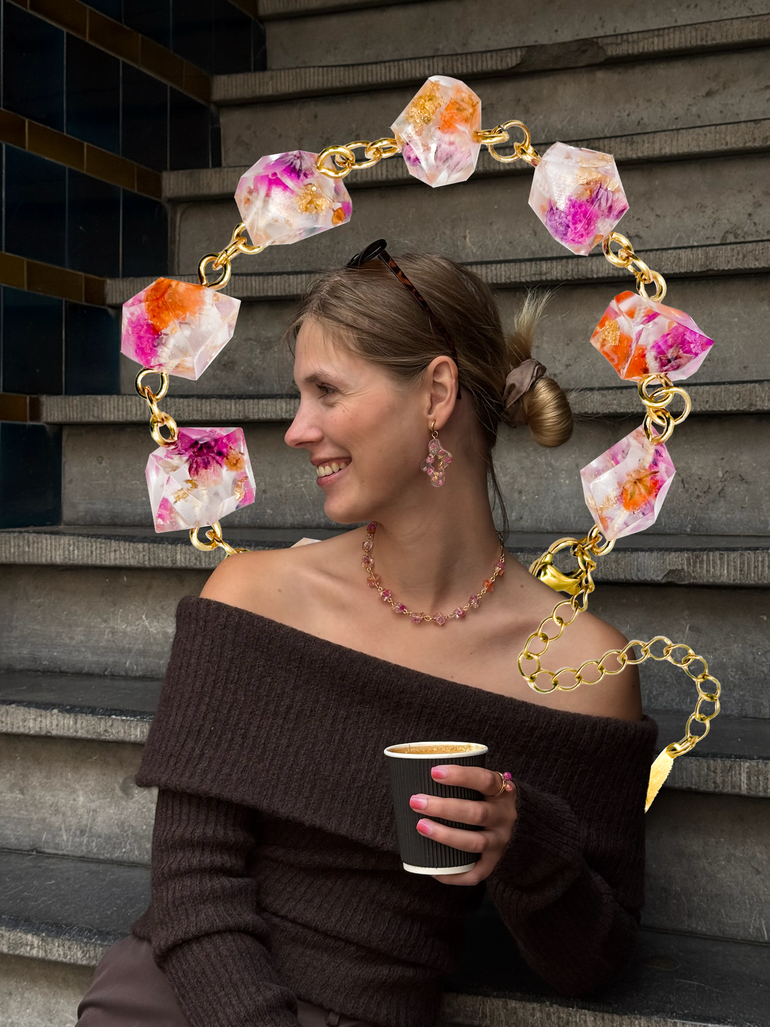 Deze statement armband verbindt meerdere kristallen hangers met elkaar, elk gevuld met levendige bloemen in tinten van koraal, magenta en roze. Het herhalende ontwerp creëert ritme en beweging, terwijl het gouden metaal alles elegant samenbrengt.