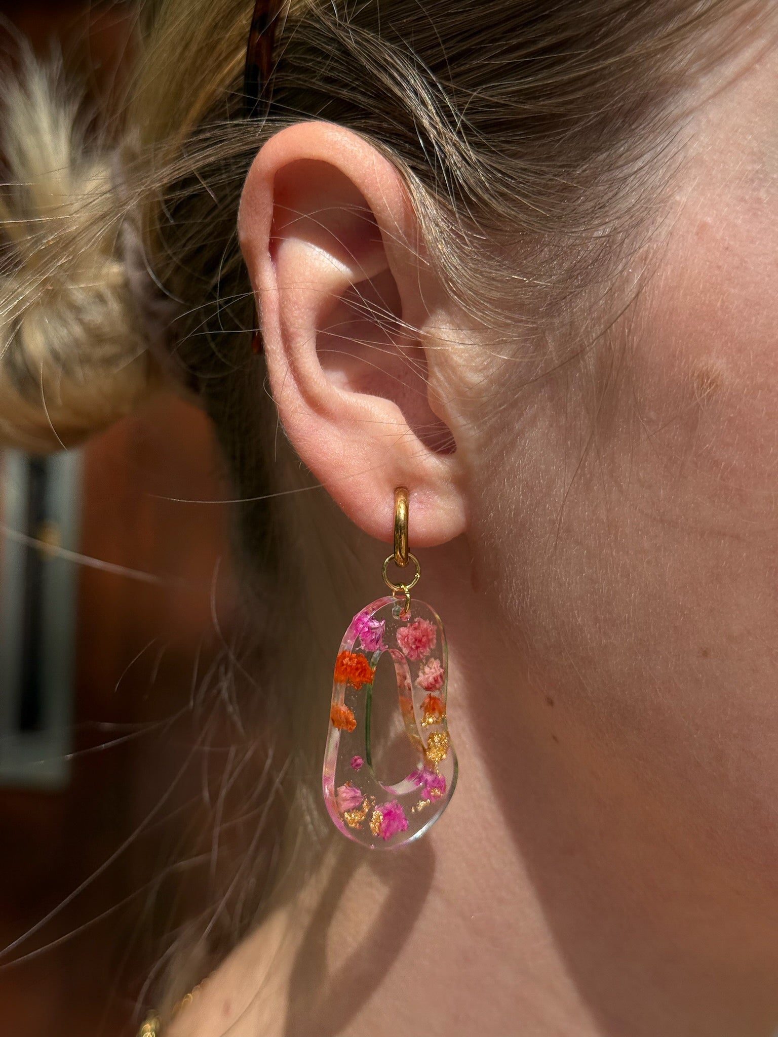 Een frisse toevoeging aan de Blossom Chapter, deze oorbellen introduceren een vloeiend organisch silhouet dat levendig en dynamisch aanvoelt. Iets tussen een kiezel en een amoebe, met onregelmatige rondingen die roze en magenta bloemen bevatten met subtiele gouden accenten. Elk paar voelt sculpturaal en uniek, alsof de natuur zelf in beweging is vastgelegd.