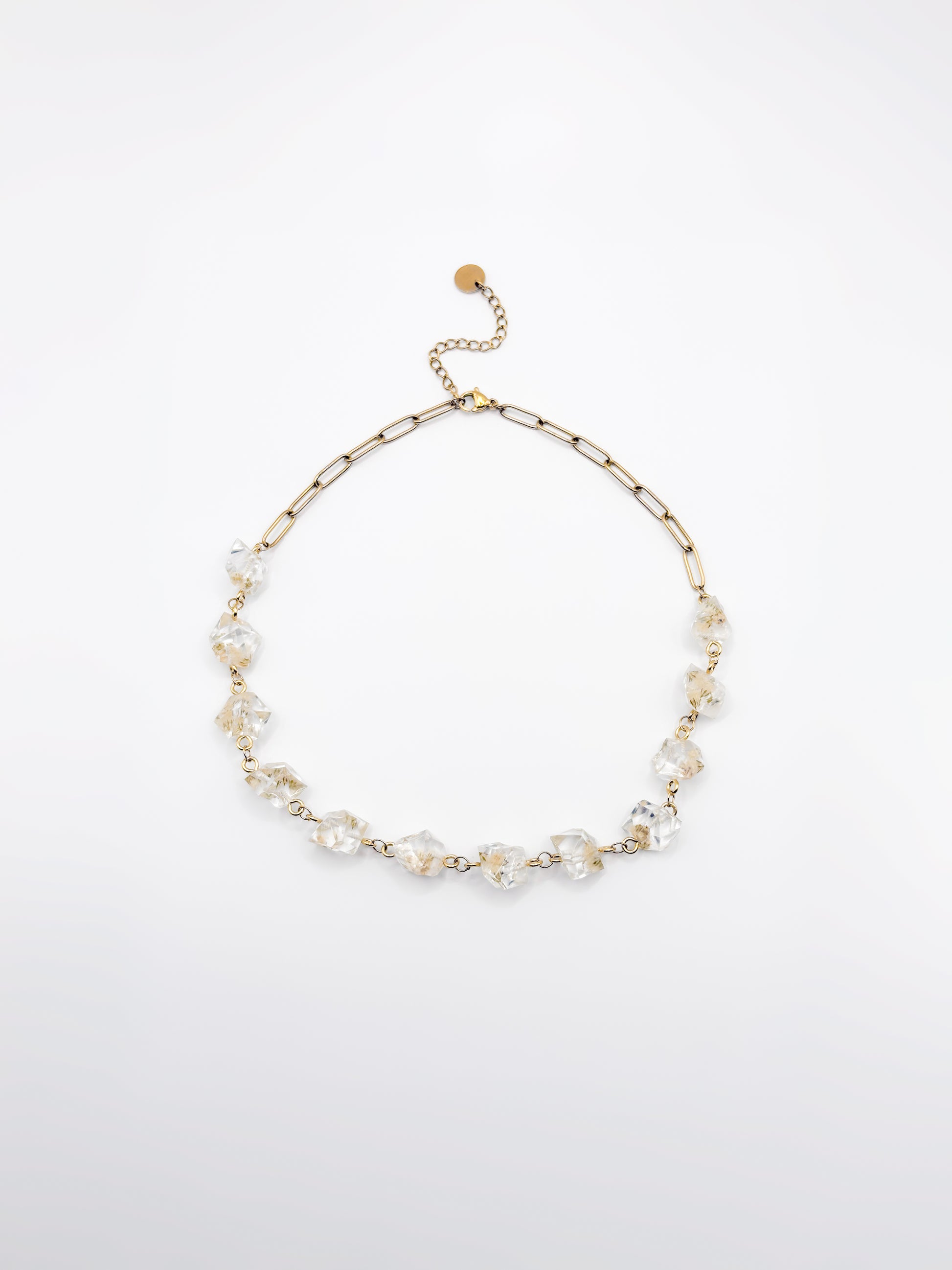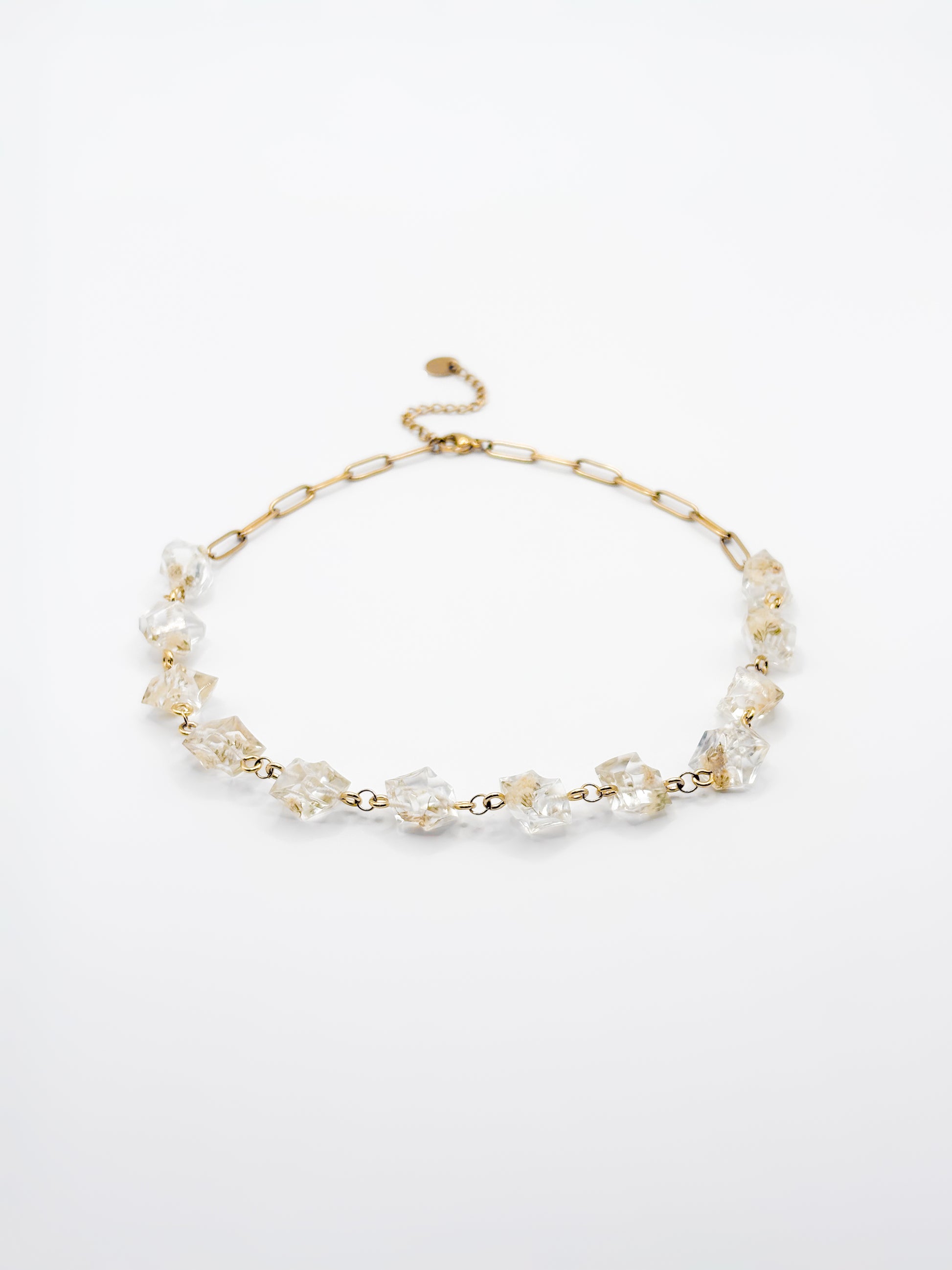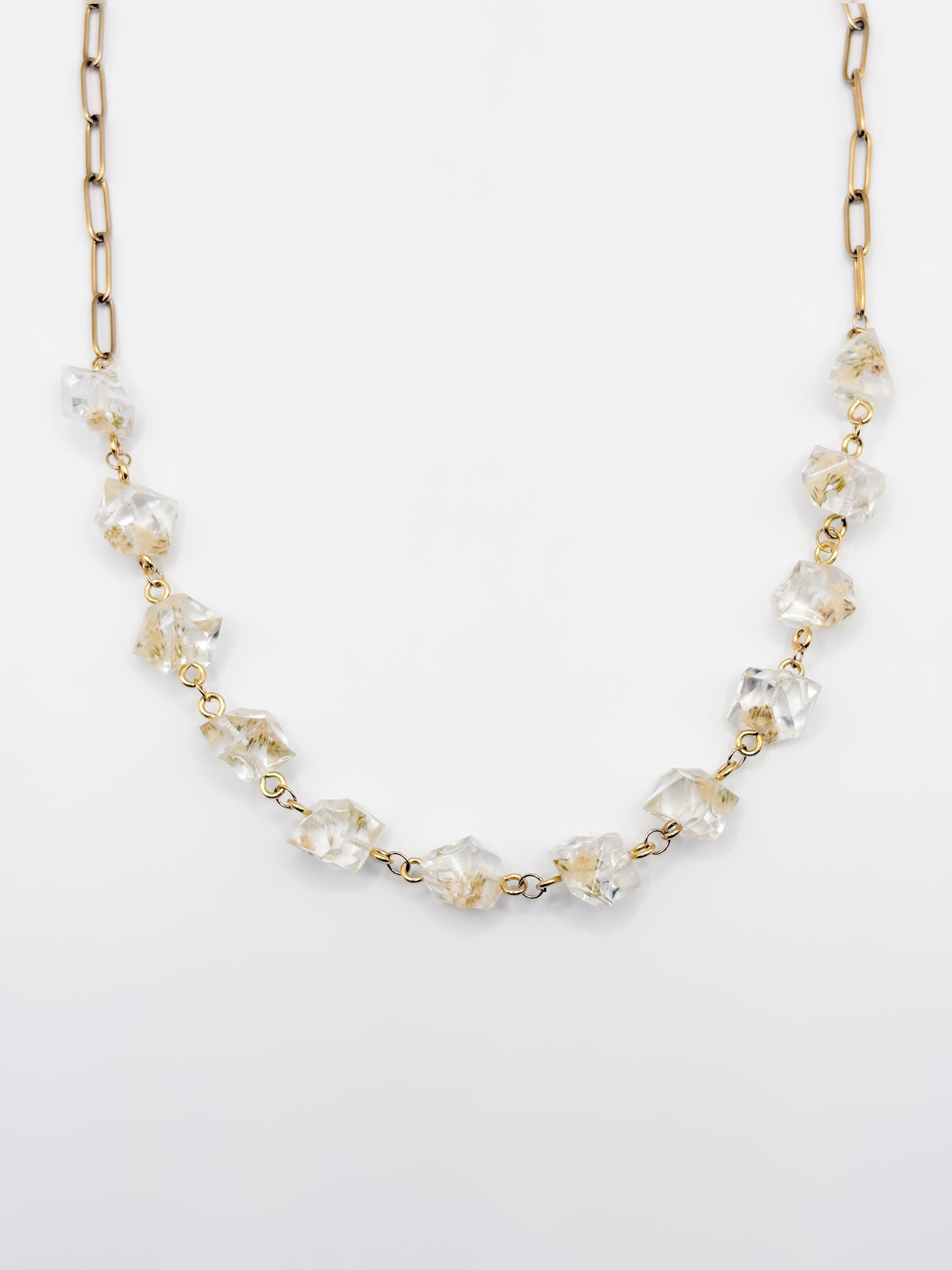 A subtle edge wrapped in softness. This necklace features a series of crystal-shaped resin pendants, each holding natural gypsophila flowers in their purest form. The geometric design creates a modern silhouette while preserving the organic beauty of each flower. Finished with a chunky stainless steel chain at the back, it balances structure with comfort. Available in gold or silver, this piece offers quiet strength and timeless style.