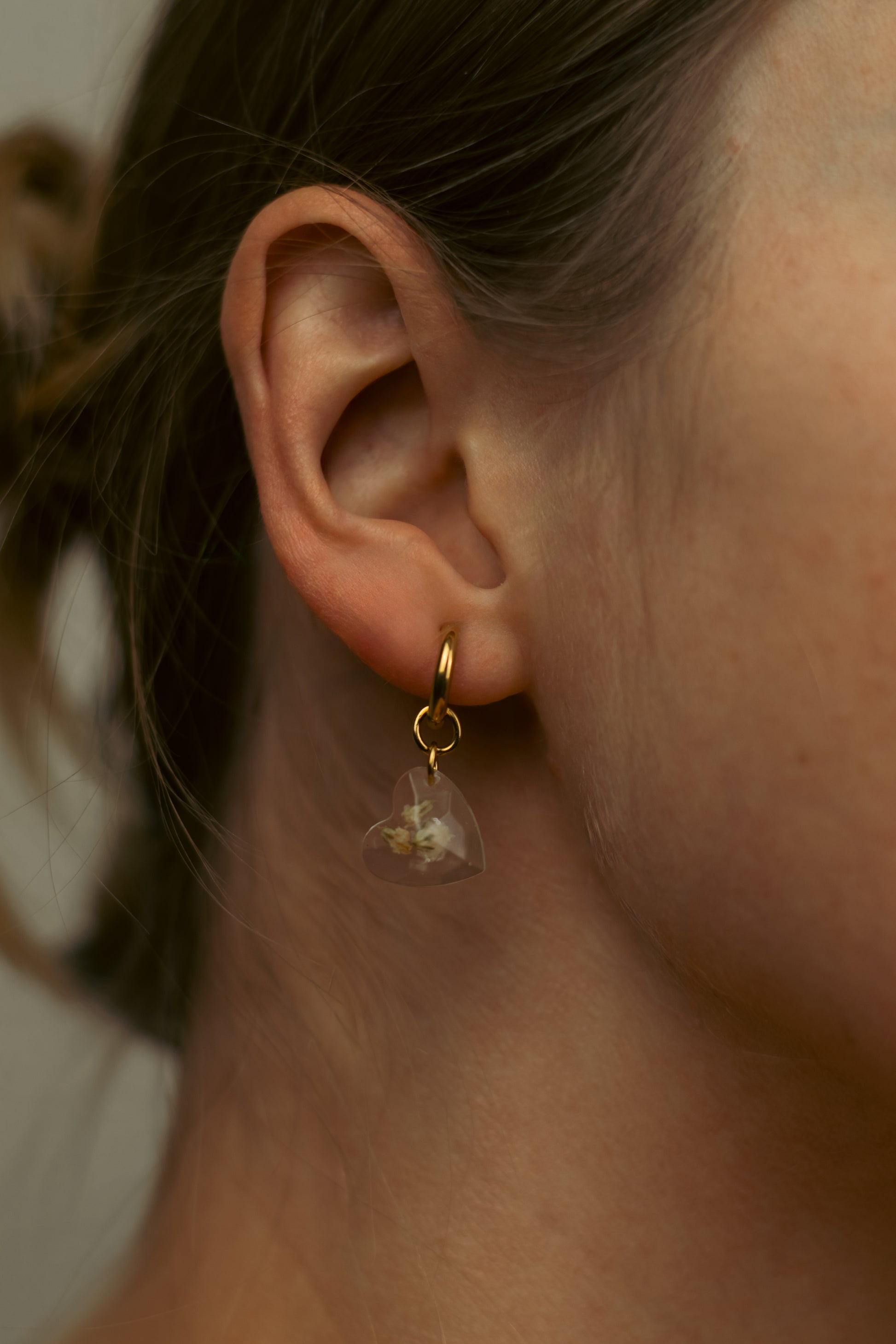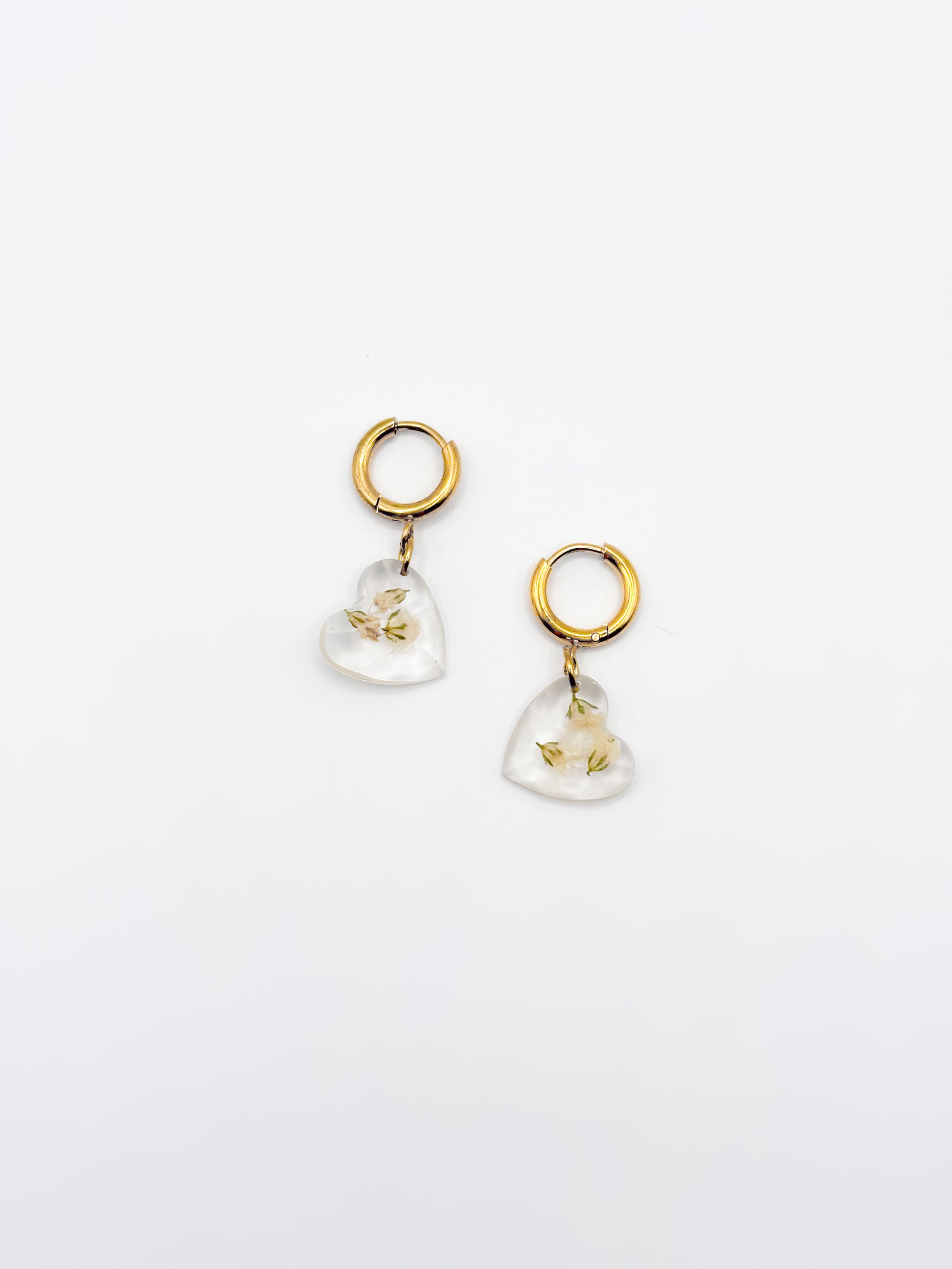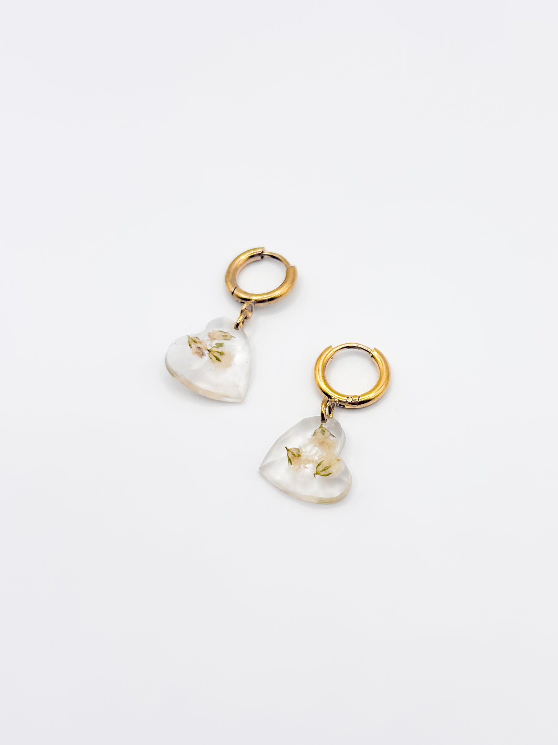 Sweet and sentimental with a polished finish. These huggie hoop earrings feature heart-shaped resin pendants, each holding natural gypsophila flowers preserved in crystal-clear resin. Paired with gold or silver hoops, they offer a soft romantic touch you can wear every day.