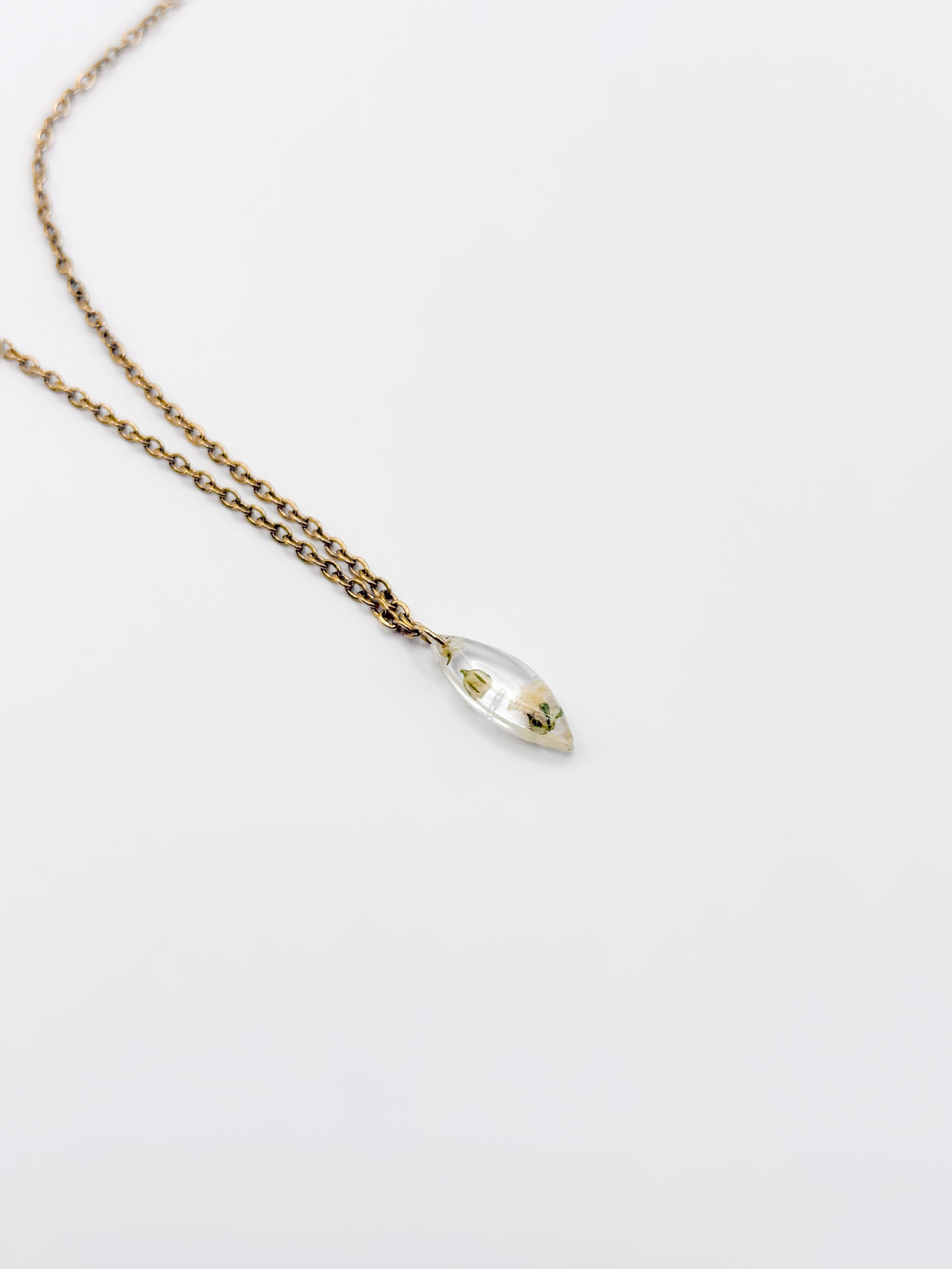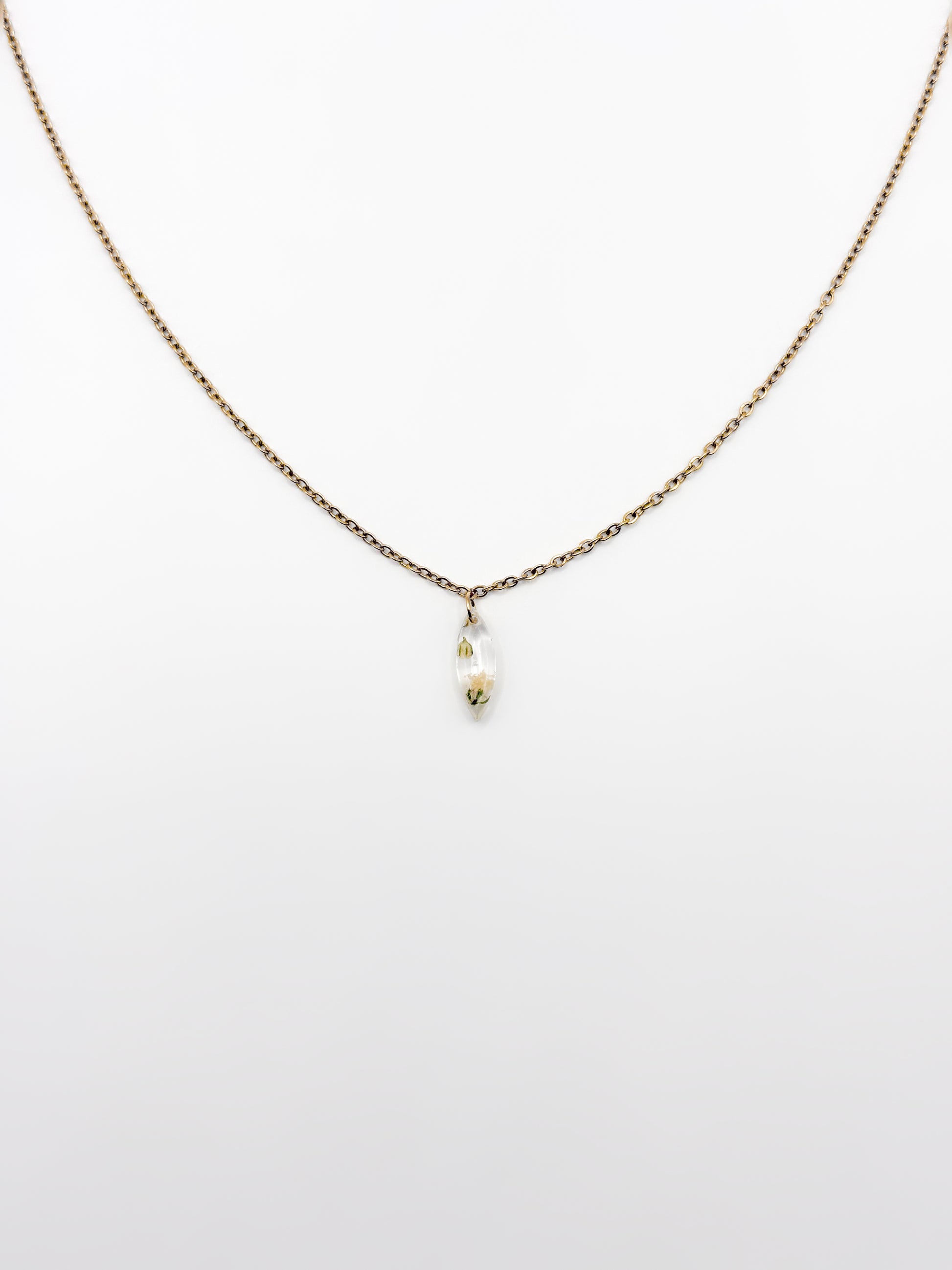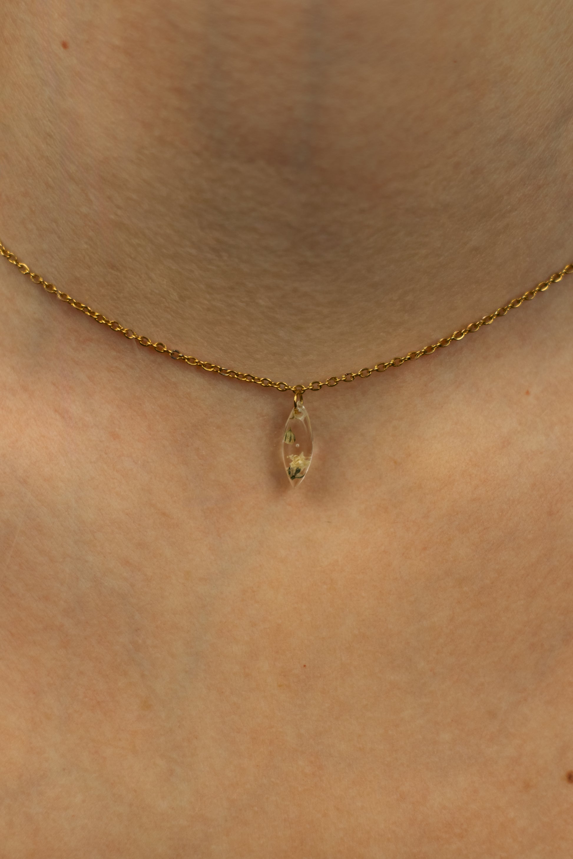 Small detail, big meaning. This necklace features a tiny resin pendant on a fine, subtle chain, each one holding natural gypsophila flowers preserved in clear resin. Available in gold or silver, it’s a quiet piece made to keep your story close, every single day.
