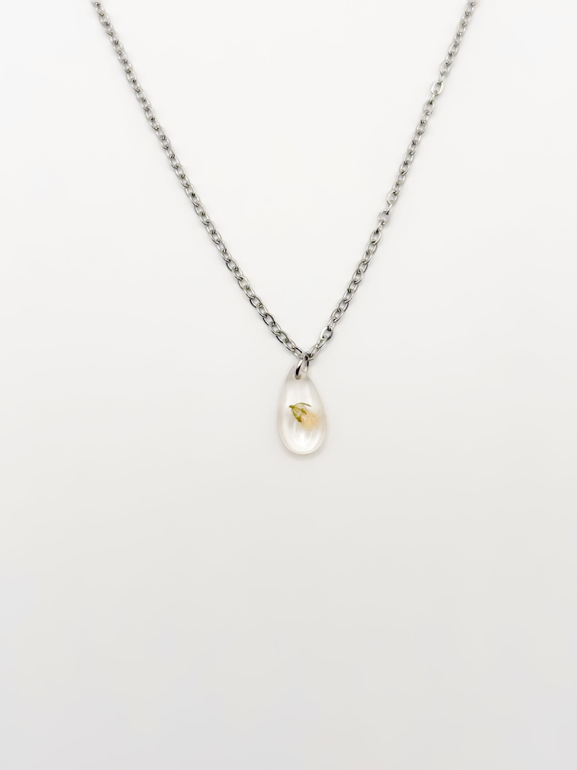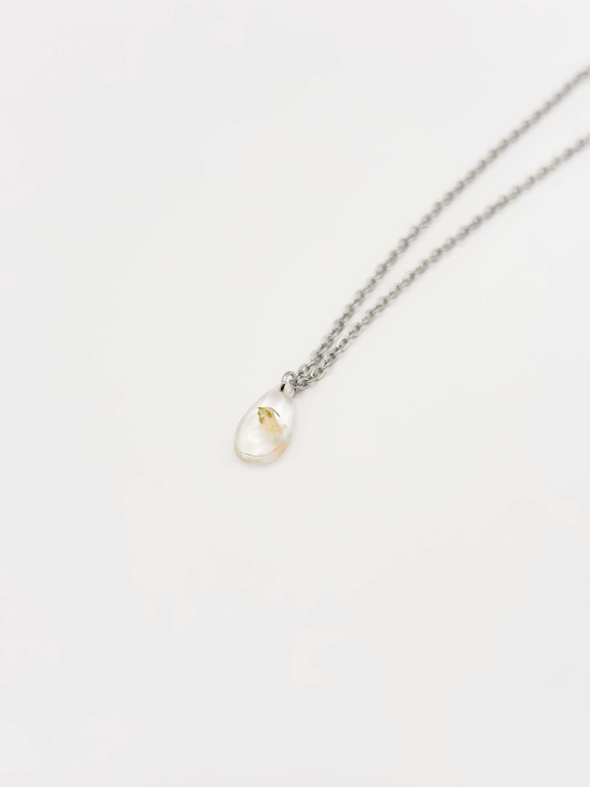 Delicate and deeply personal. This necklace features a fine, minimal chain and a tiny teardrop-shaped resin pendant holding a single natural gypsophila flower. Available in gold or silver, it is a quiet celebration of nature’s beauty, designed for everyday wear with lasting meaning.