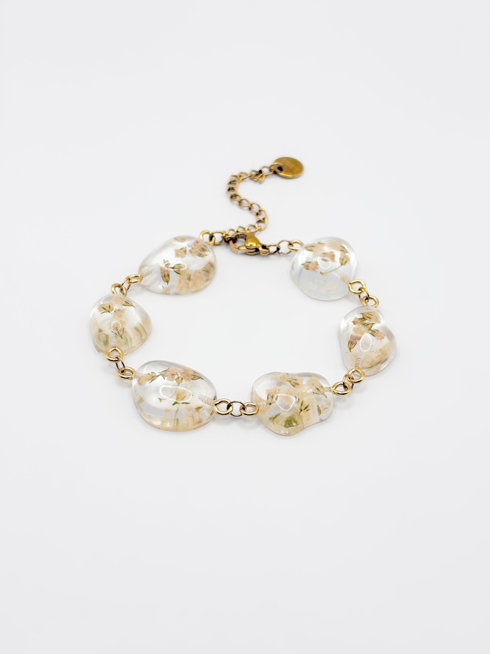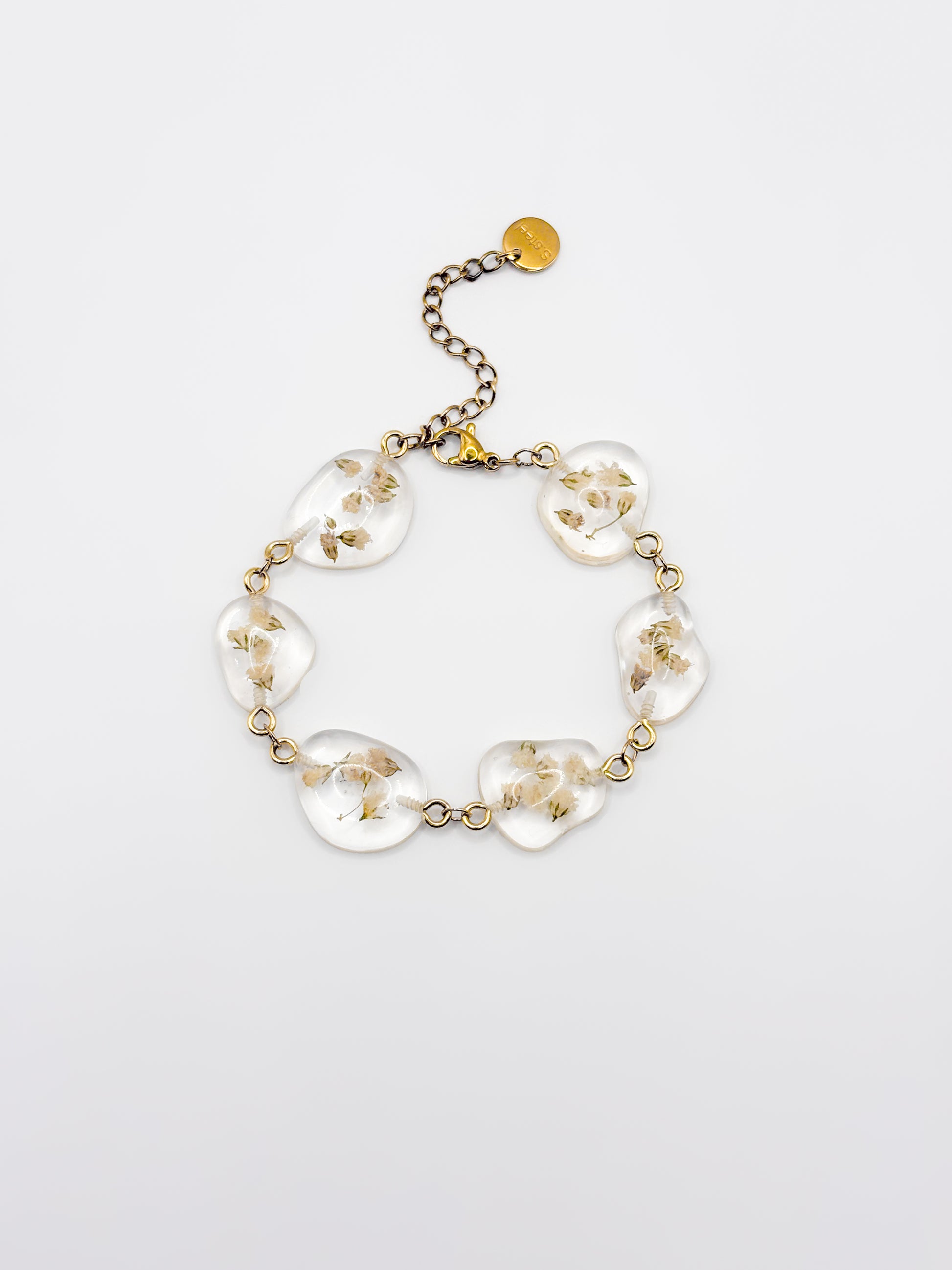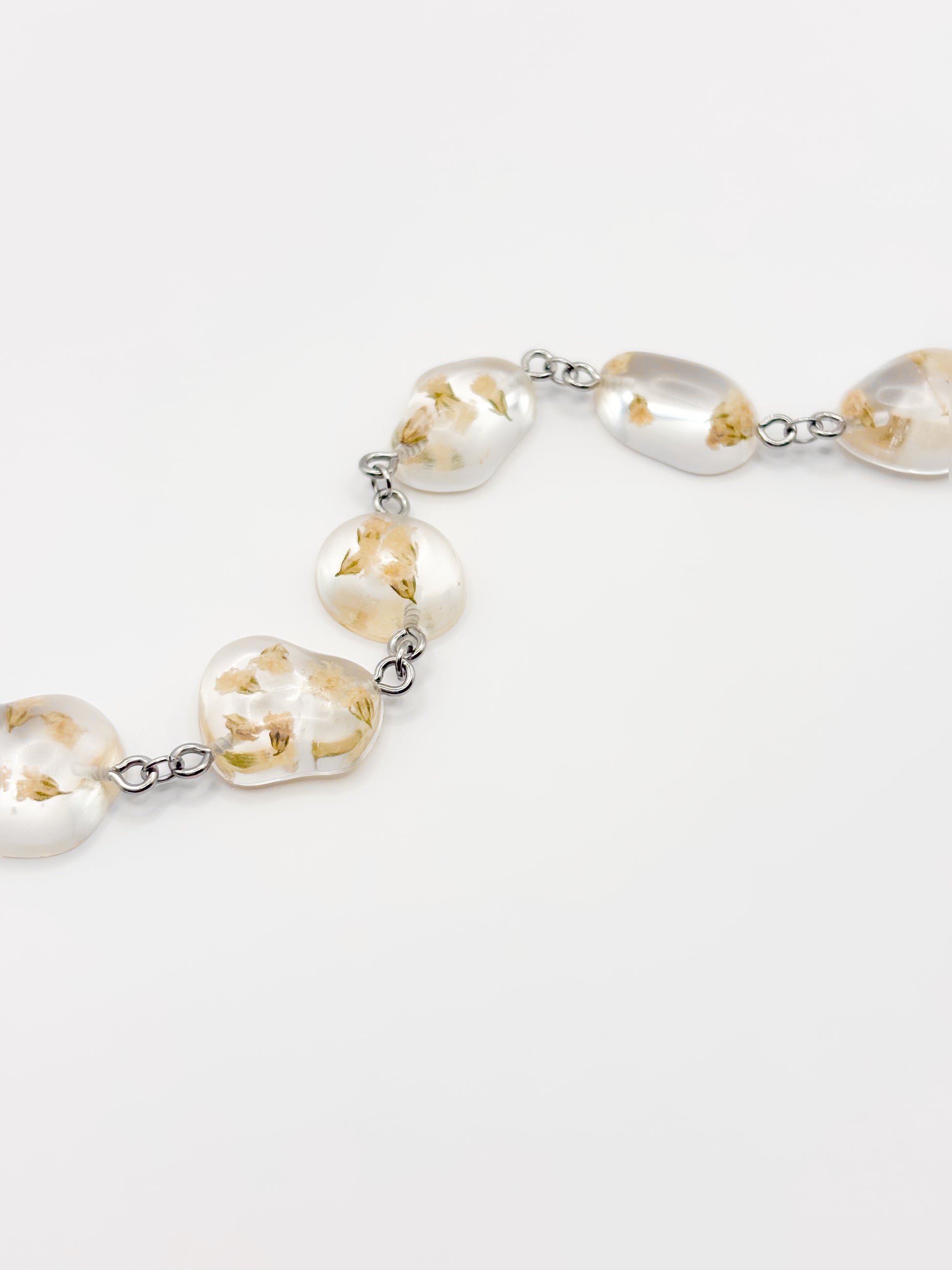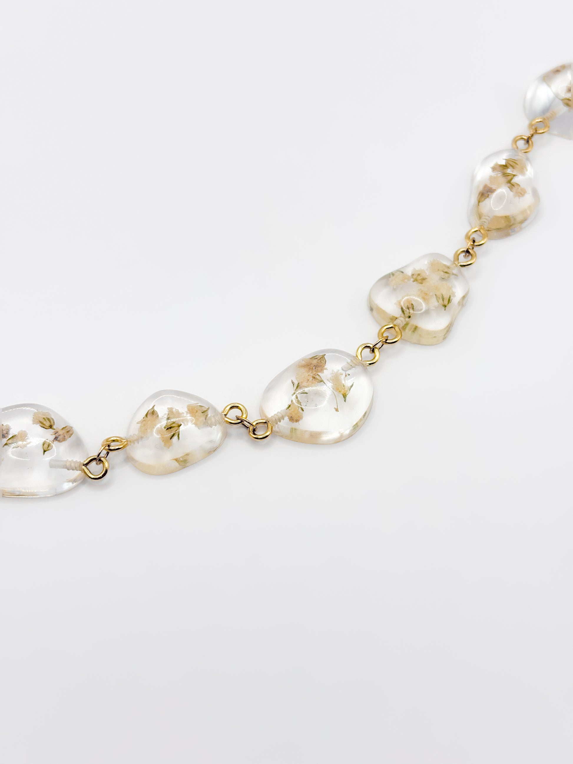 A softer take on bold. This bracelet features smaller resin pebbles than its necklace counterpart, each encasing natural, un-dyed gypsophila flowers in clear resin. Connected pebbles wrap the wrist in a quiet yet confident statement. Understated in scale but rich in detail, it is a piece you’ll reach for daily, effortlessly elegant and endlessly yours.