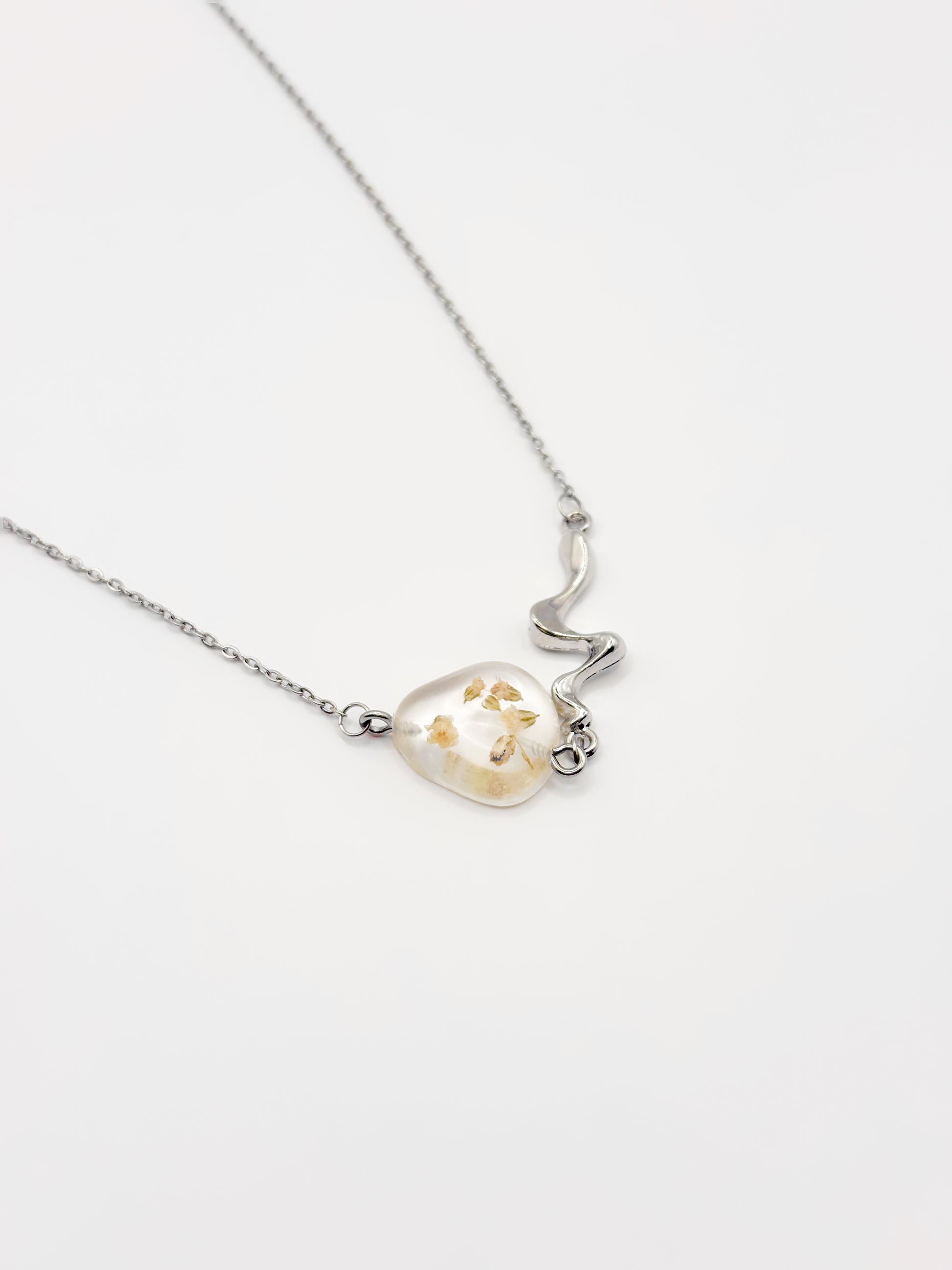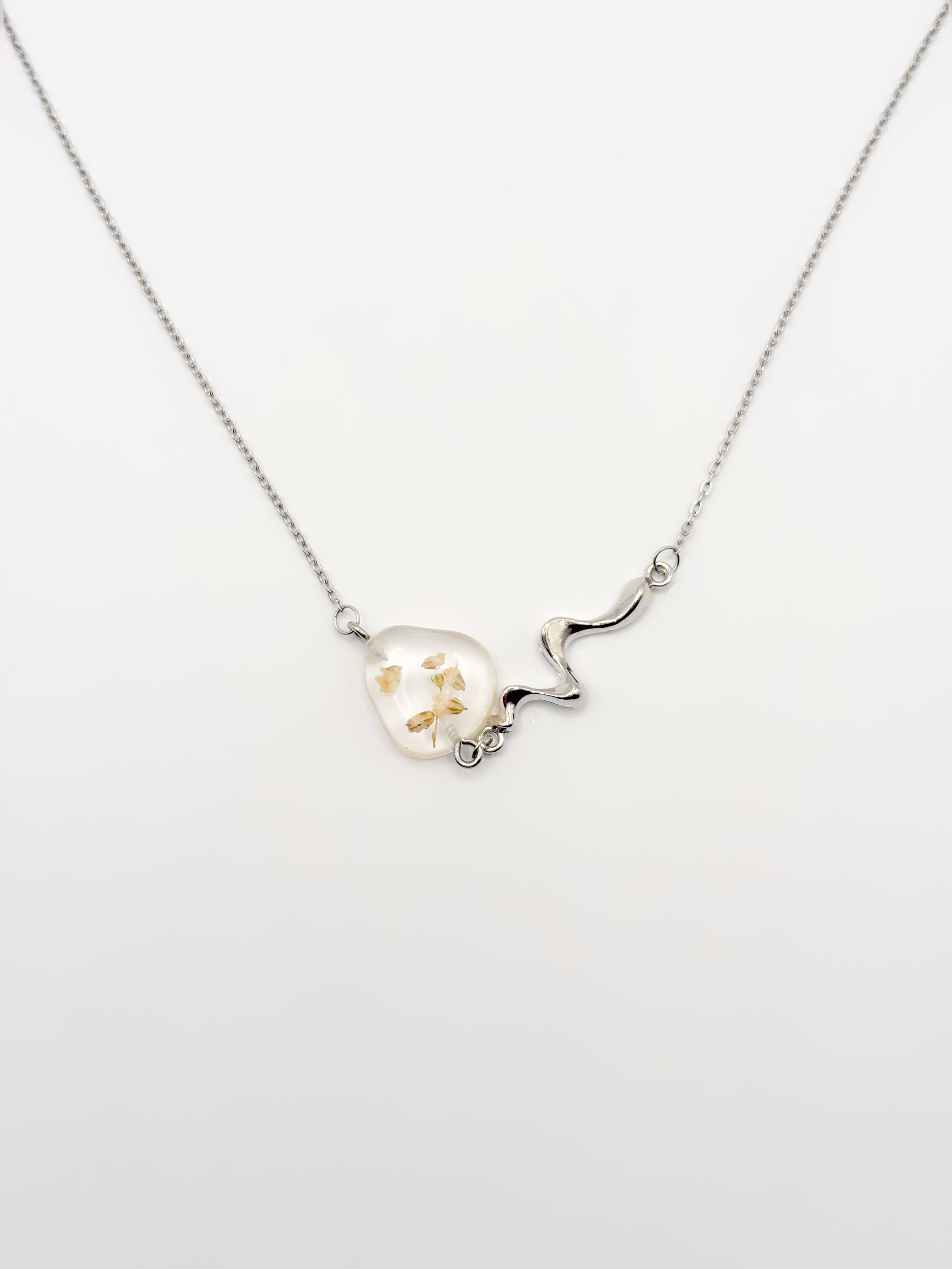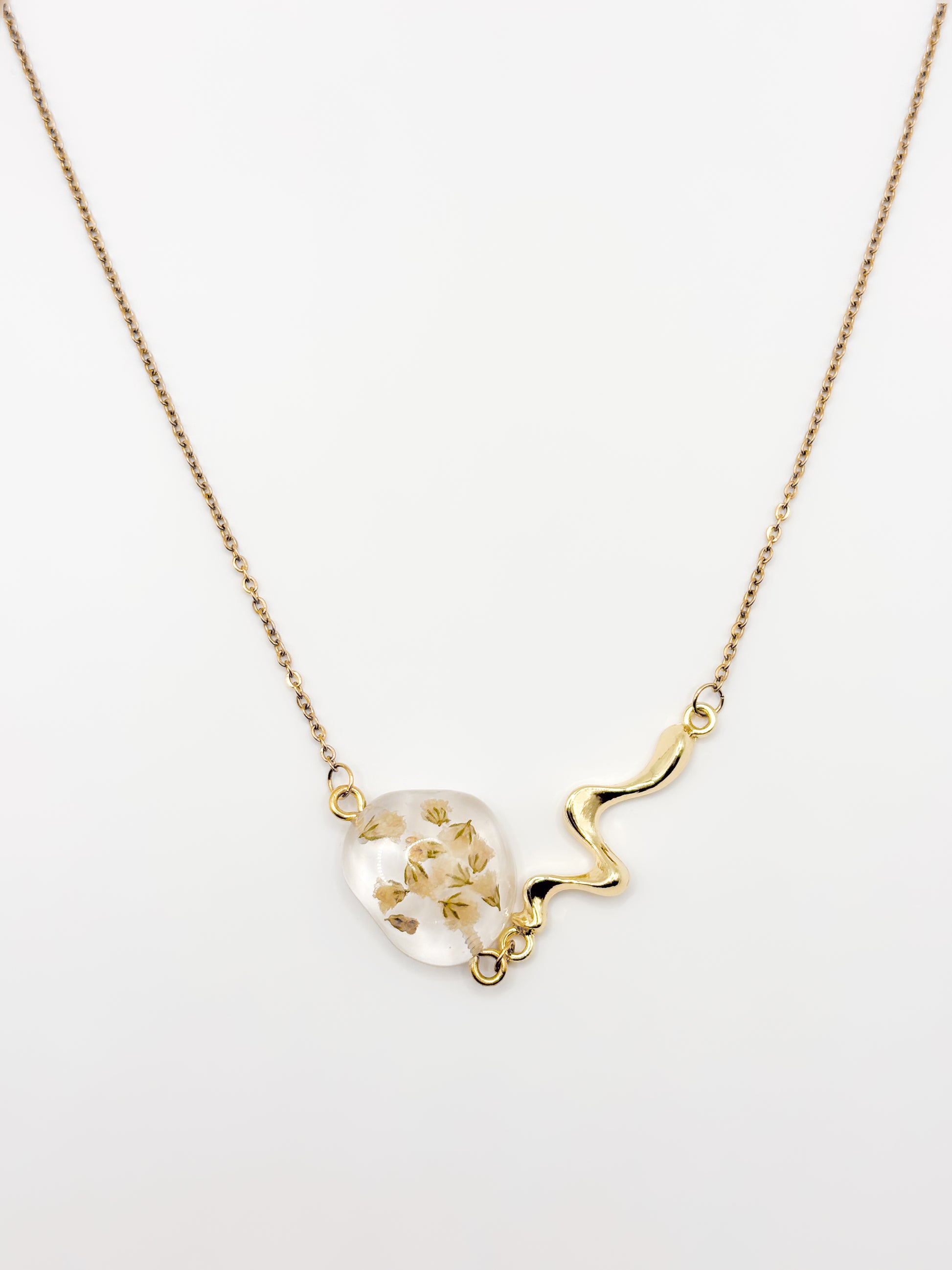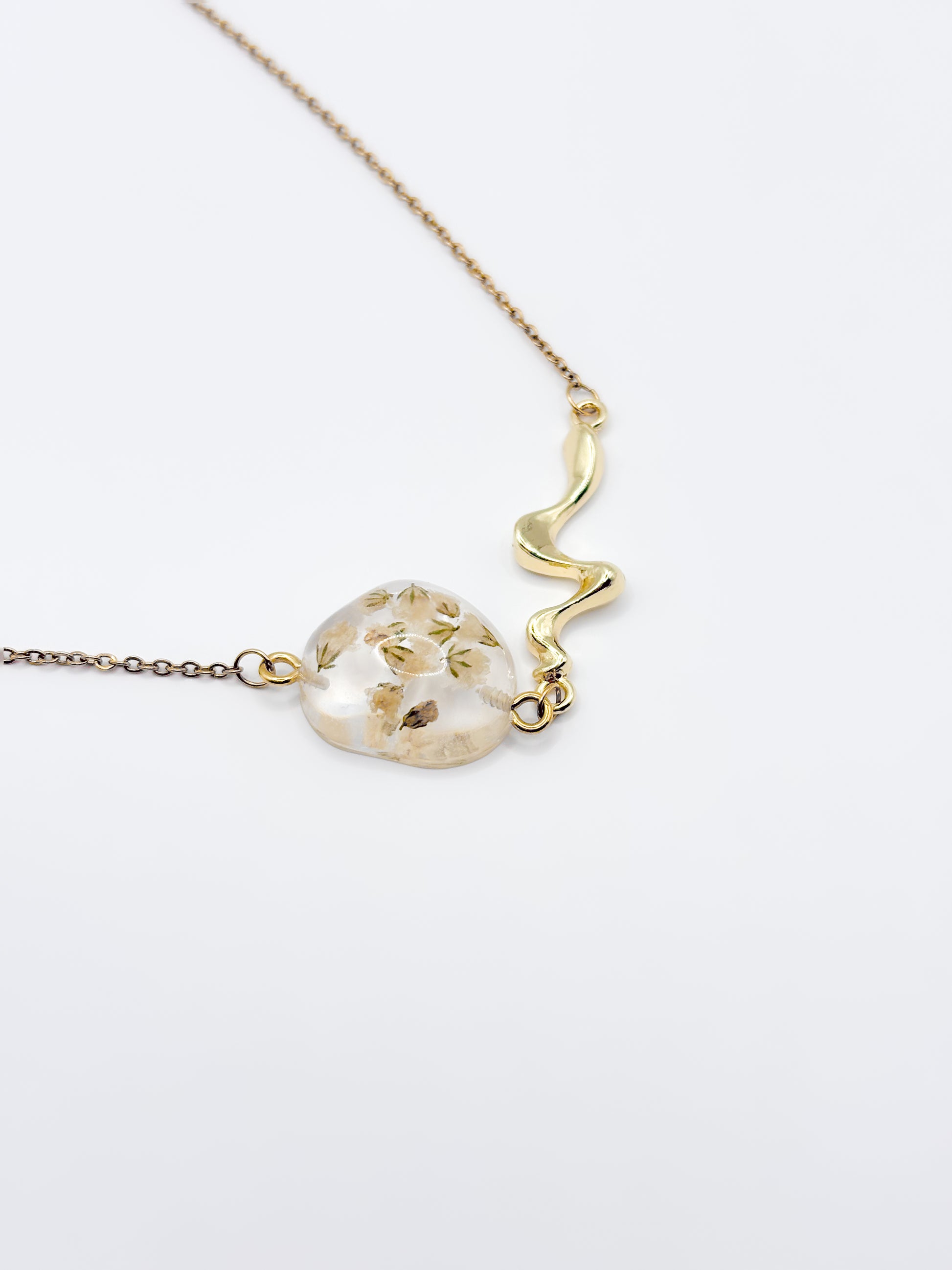 Delicate with a sculptural twist. This slim chain necklace features a single resin pebble pendant, each one cradling a natural gypsophila flower preserved in crystal-clear resin. The pendant connects to the chain with a fluid, liquid-like metal detail that adds an artistic touch to the minimalist design. Available in gold or silver, it’s the kind of piece that quietly draws attention and lingers in memory.
