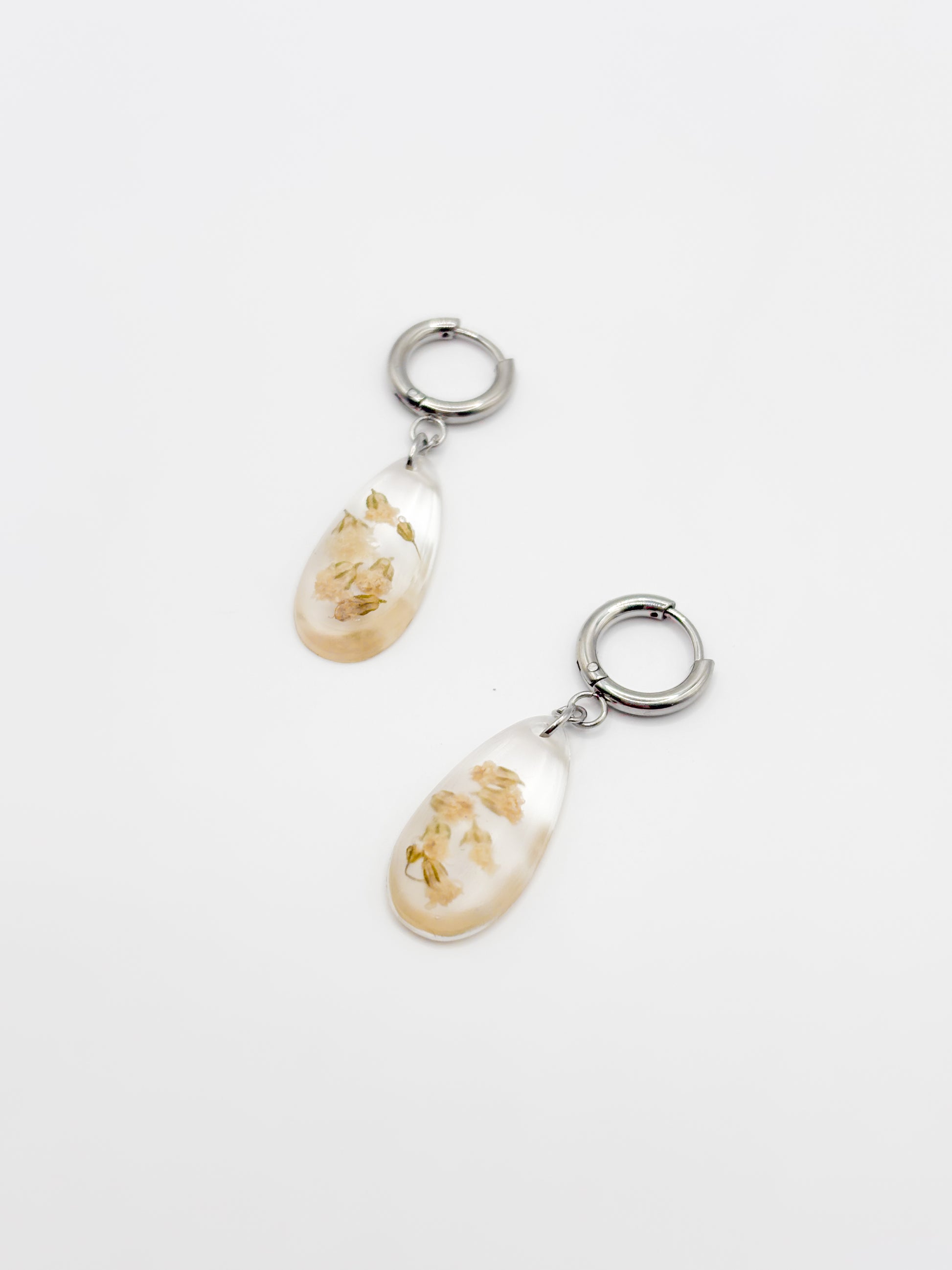Timeless and tender. These huggie hoop earrings feature teardrop-shaped resin pendants, each preserving natural gypsophila flowers in clear resin. The soft curve of the teardrop pairs beautifully with the shine of gold or silver hoops, creating a look that is both graceful and grounded.