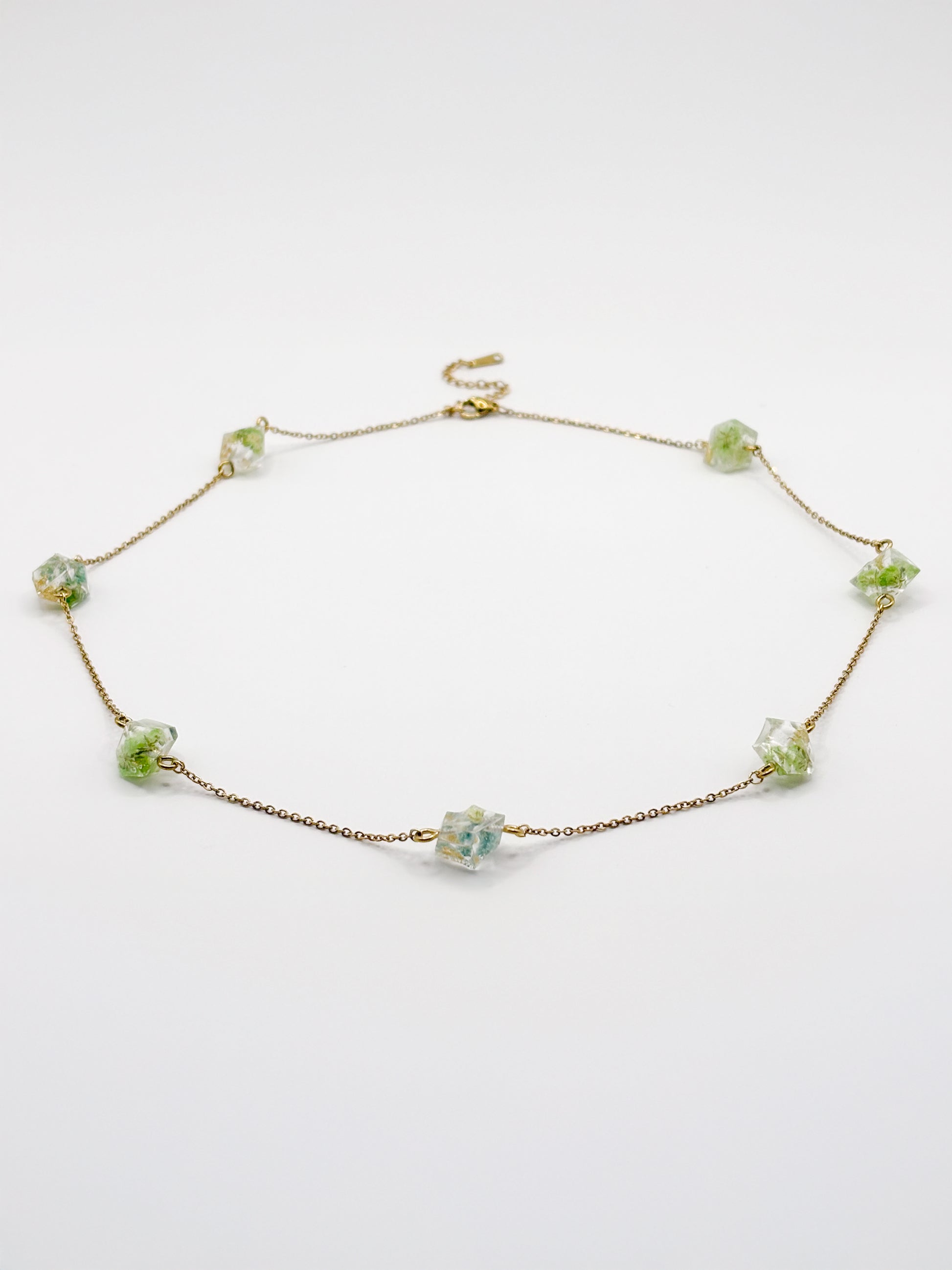 The Forgotten Gardens Crystal Strand Necklace is the first breath of fresh air after winter. Inspired by hidden gardens in Luxembourg, this piece features real blue and green flowers, carefully preserved to capture the calm beauty of early spring.