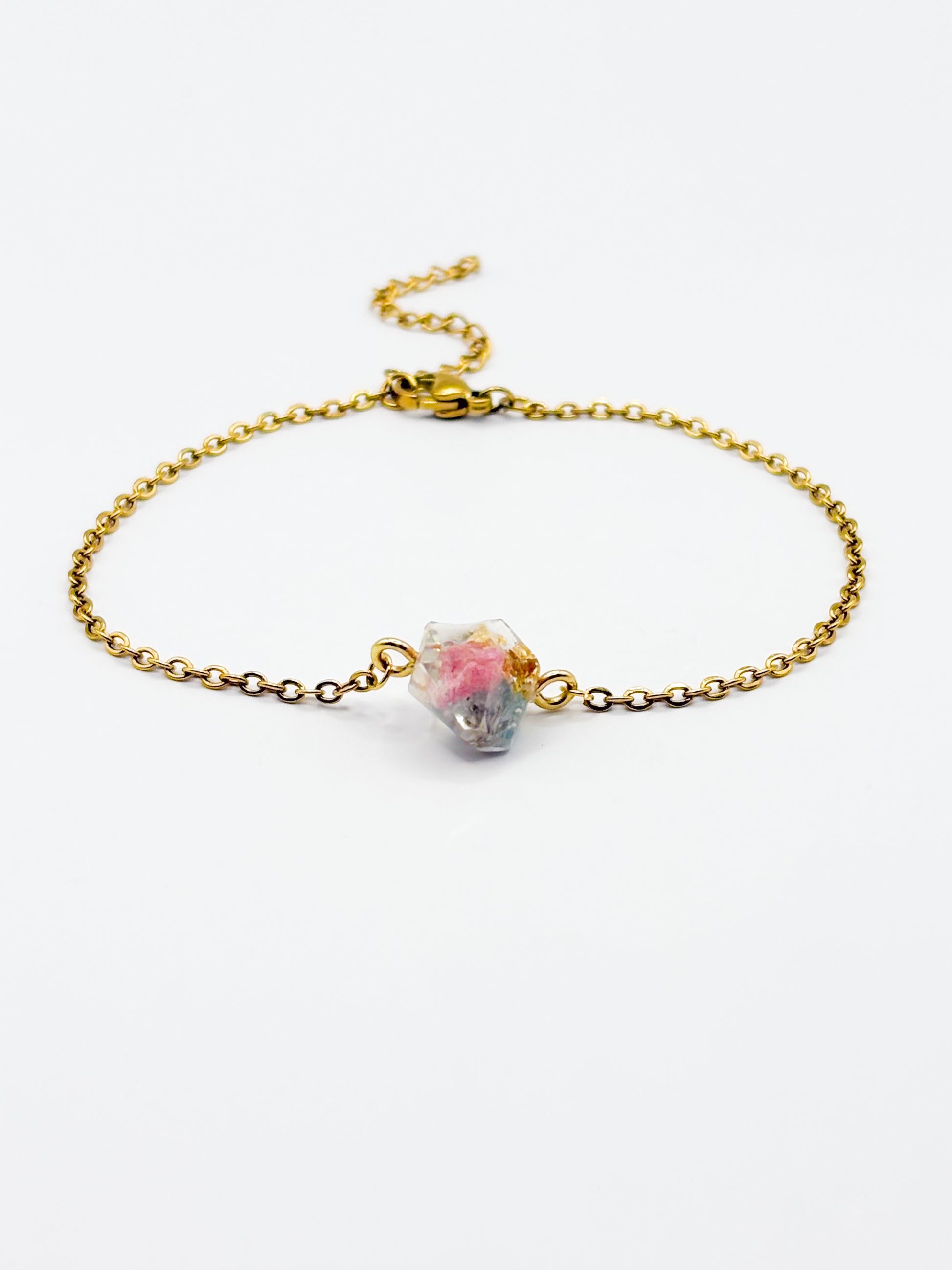 Simple, timeless, and full of meaning. A single crystal-shaped pendant is centered on a slim gold-plated chain, featuring a Lisbon flower encased in resin with hints of soft color and gold leaf. Ideal for everyday wear, or as a subtle tribute to a place, a memory, or yourself.