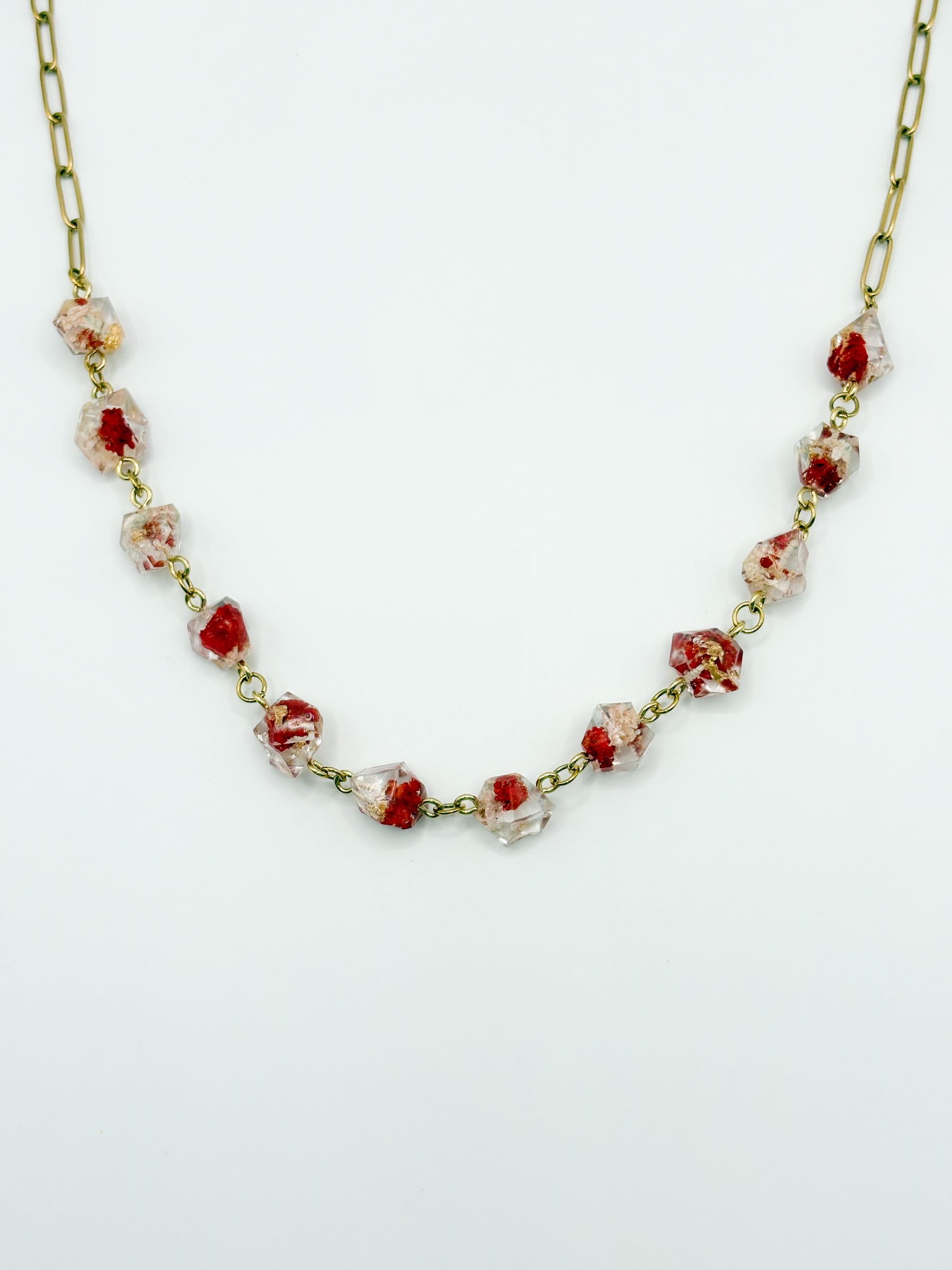 The Mon Chéri Crystal Necklace is a bold statement necklace made from faceted resin crystal pendants, each one holding real flowers in deep red and soft pink tones. The crystals are connected with gold hardware and finished at the back with a chunky paperclip chain, designed to sit comfortably around the neck while adding a modern, confident edge. Resting visibly across the collarbone, this necklace catches the light with every movement and serves as a powerful reminder that self love deserves to be worn front and center.