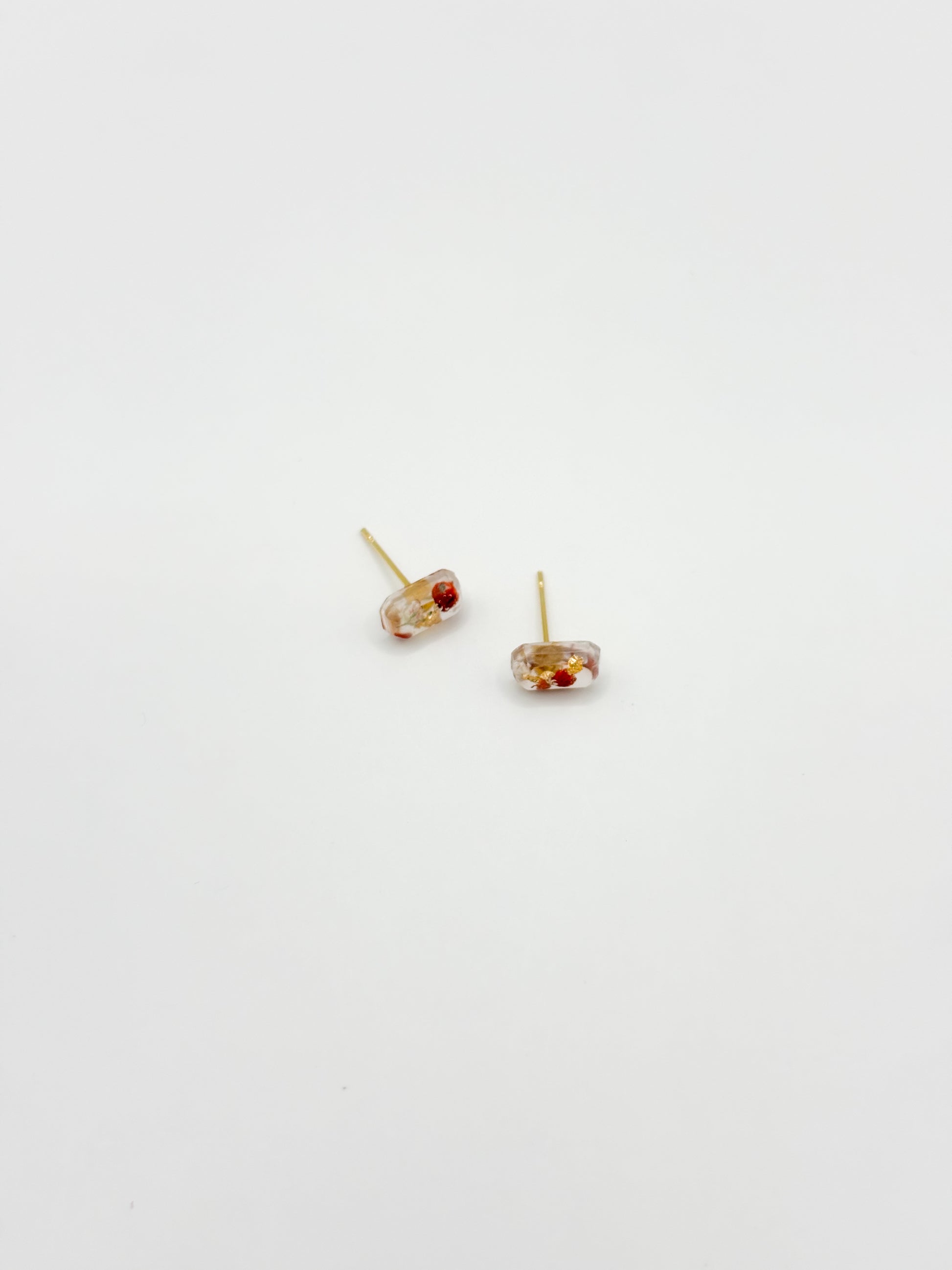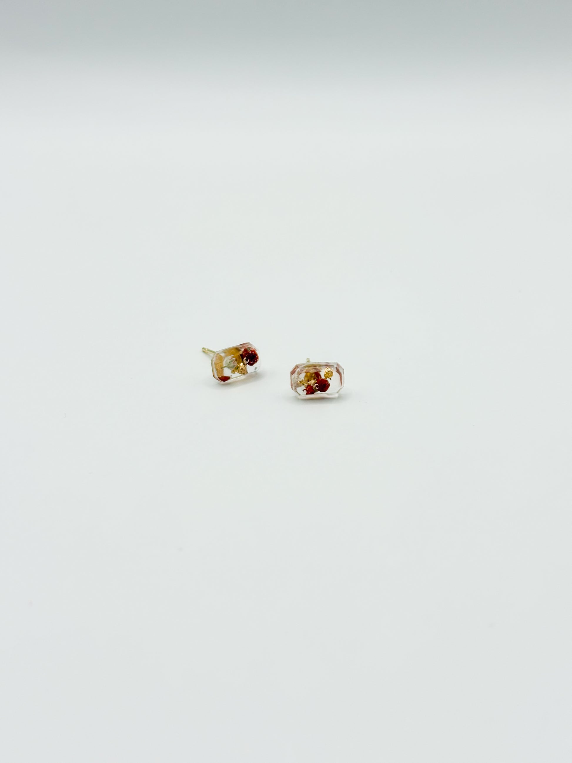The Mon Chéri Mini Emerald Cut Stud Earrings feature small emerald cut resin studs designed to sit neatly against the ear. Each stud contains real flowers in deep red and soft pink tones, finished with delicate gold leaf for a soft, warm glow. Refined and lightweight, these studs offer a clean, polished look that feels effortless for everyday wear, a subtle reminder that self love lives in the smallest, intentional details.