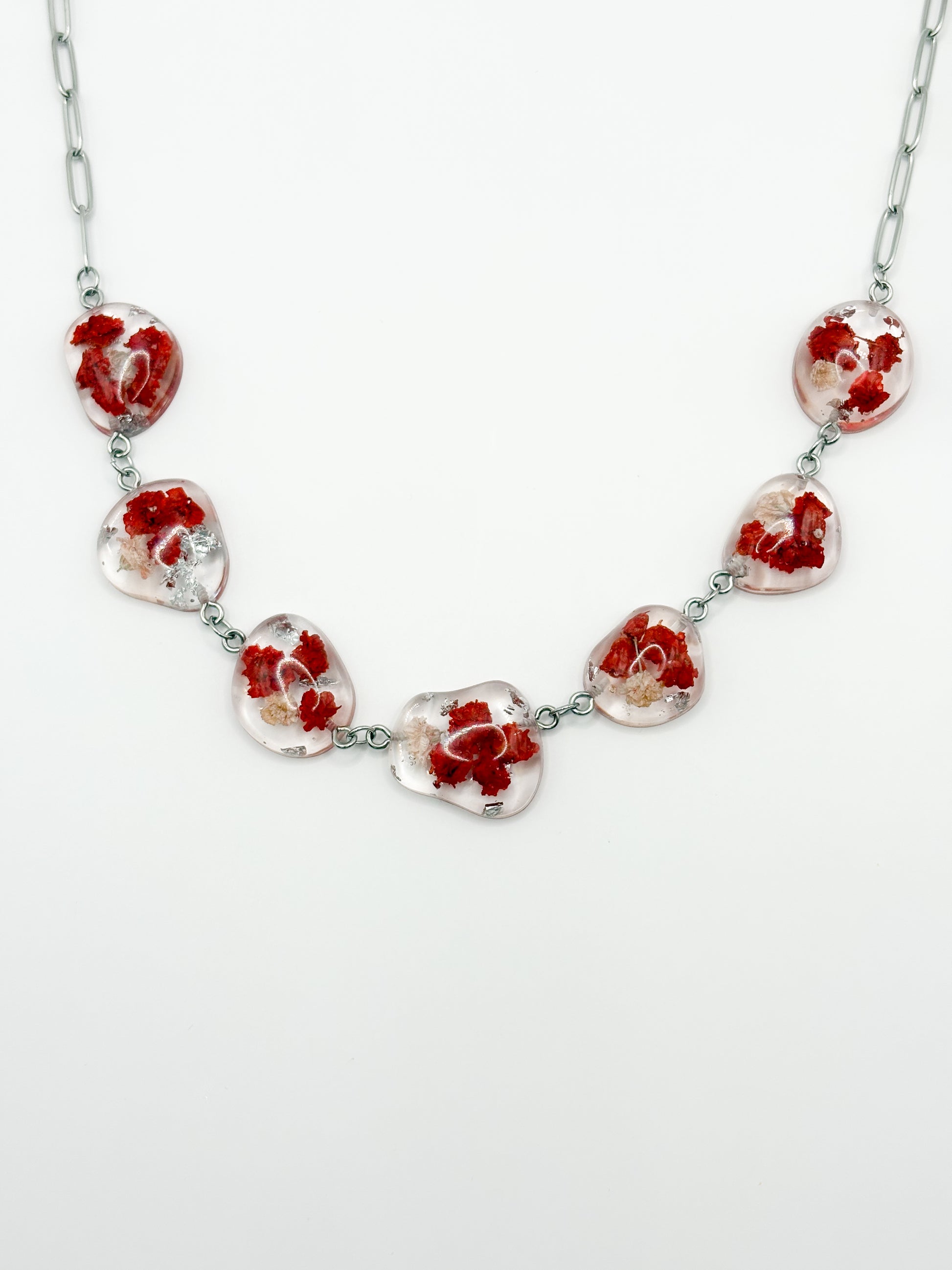 The Mon Chéri Pebble Necklace is a bold statement necklace made from large, smooth resin pebbles, each one holding real flowers in deep red and soft pink tones with subtle silver flakes suspended inside. The pebbles are connected with polished silver hardware and finished at the back with a chunky paperclip chain, allowing the necklace to sit comfortably around the neck while adding a modern edge. Structured yet fluid, this piece rests visibly across the collarbone and feels expressive without being heavy, designed as a powerful reminder that self love deserves to take up space.