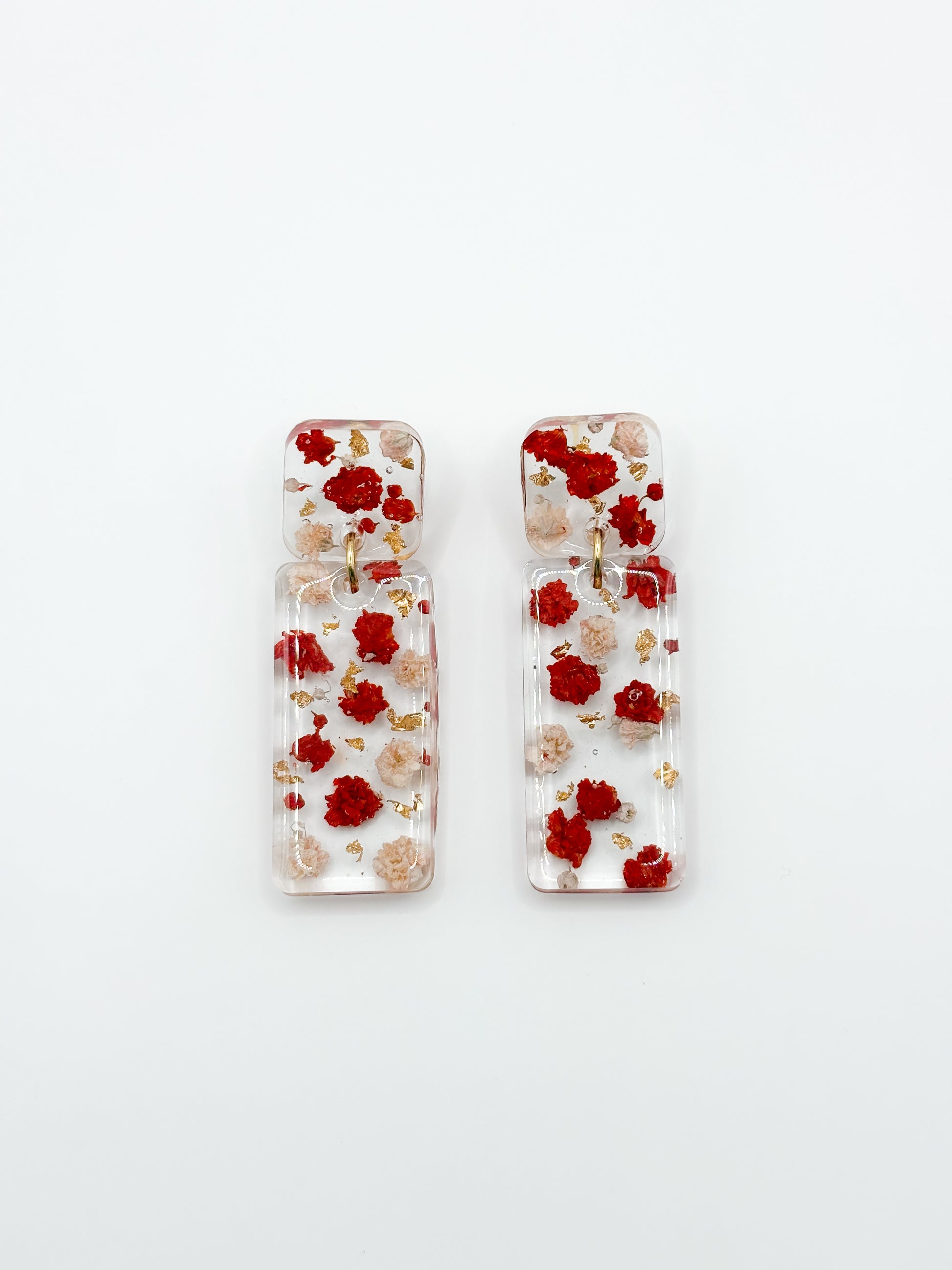 These rectangular statement earrings feature real gypsophila flowers suspended inside clear resin, finished with delicate gold flakes and stainless steel, gold-plated hardware. One stud post is slightly off center, which does not affect wear but makes this pair a second chance piece and therefore discounted. Deep red and soft pink tones create a romantic contrast, while the elongated shape frames the face with a bold yet lightweight feel, making them a beautiful reminder that imperfections deserve love too.