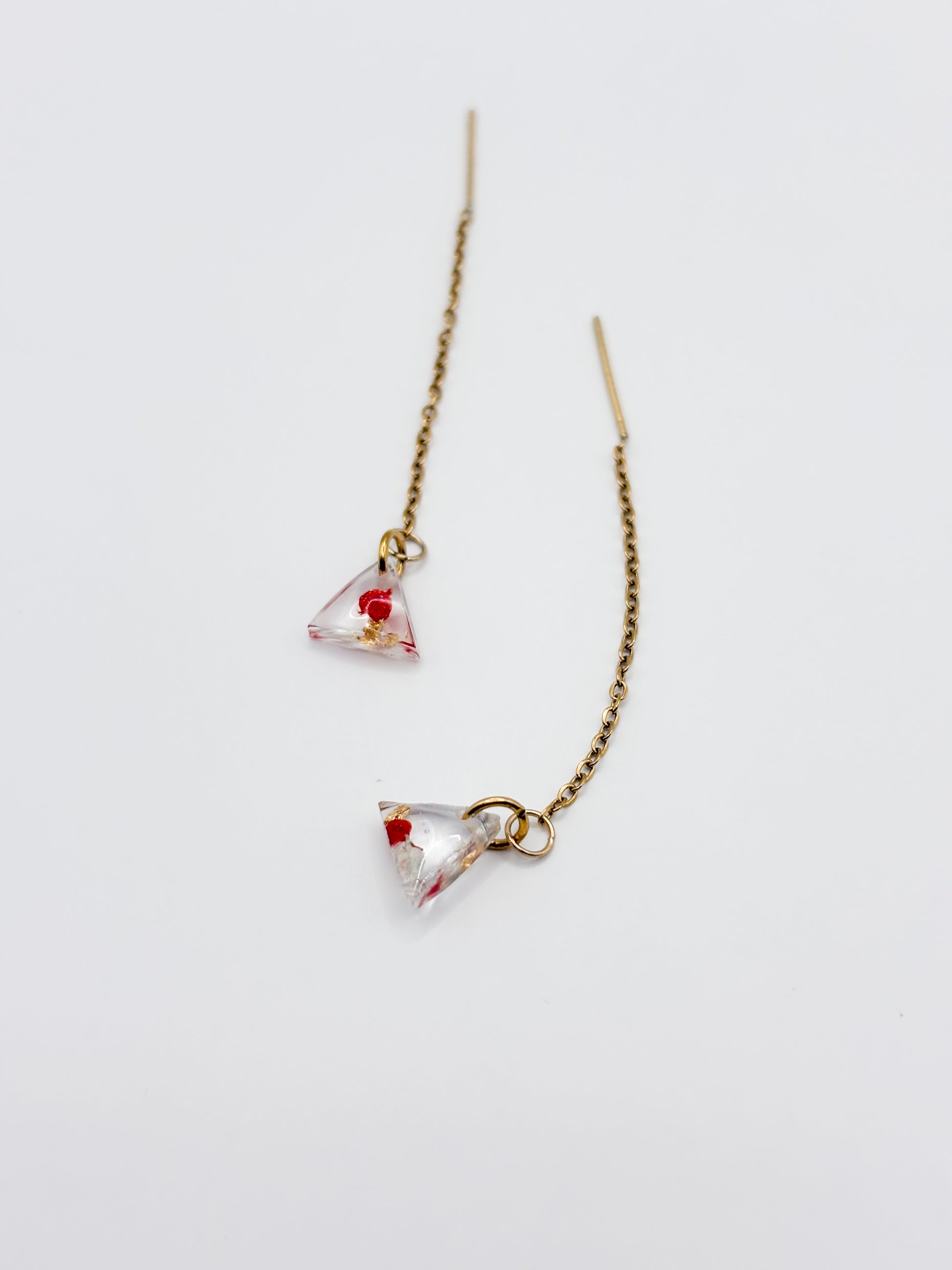 The Mon Chéri Triangle Mini Threader Earrings feature fine, lightweight threader chains finished with tiny triangle shaped resin pendants. Each pendant contains real flowers in deep red and soft pink tones, creating a subtle point of color and meaning at the end of the delicate drop. Designed to slip smoothly through the ear, these earrings create a clean, elongated line that moves softly with you. Minimal yet expressive, they are an effortless reminder that self love can be quiet, intentional, and beautifully worn.