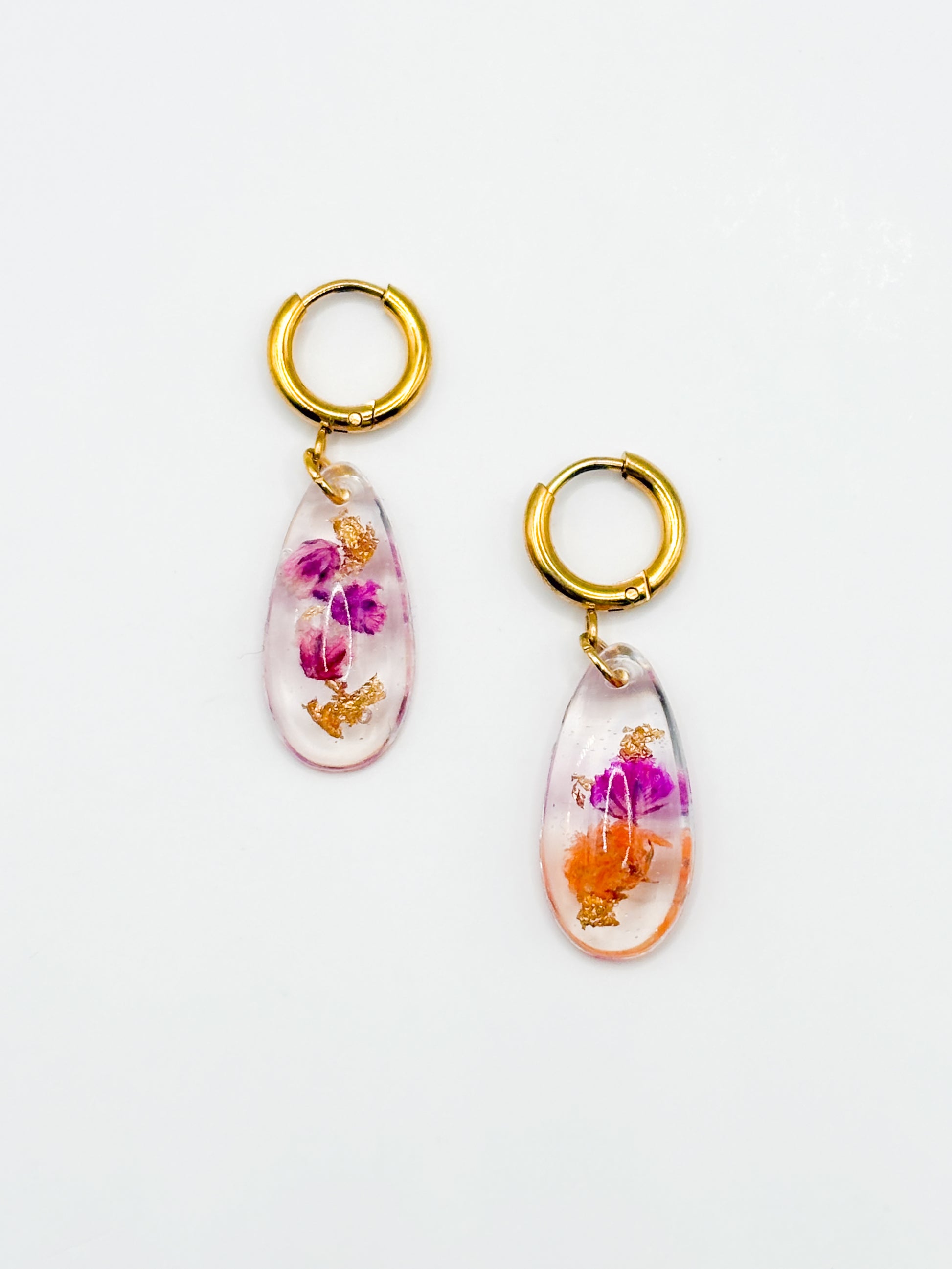 Graceful teardrop pendants dangle from gold huggie hoops, each one filled with vibrant pink and orange flowers. The teardrop shape reflects light beautifully, creating movement and shine. Classic yet whimsical, these earrings are perfect for romantic souls who love jewelry that tells a story.