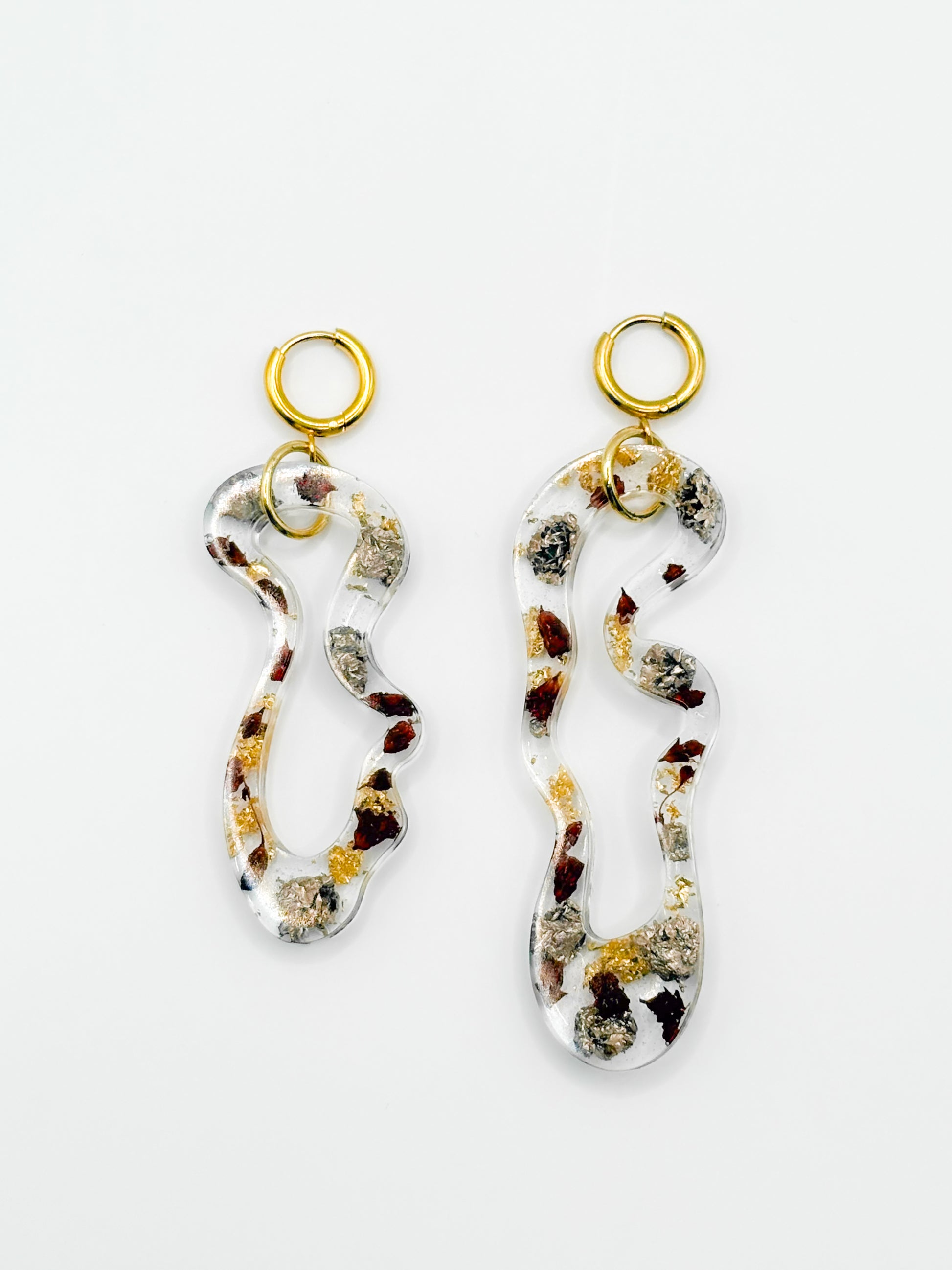 The Final Chapter Asymmetric Organic Earrings feature two sculptural pendants with a different, organically flowing shape. Suspended from gold huggie hoops, the mismatched forms feel like abstract pieces of art, brought to life with real flowers from Scheveningen.