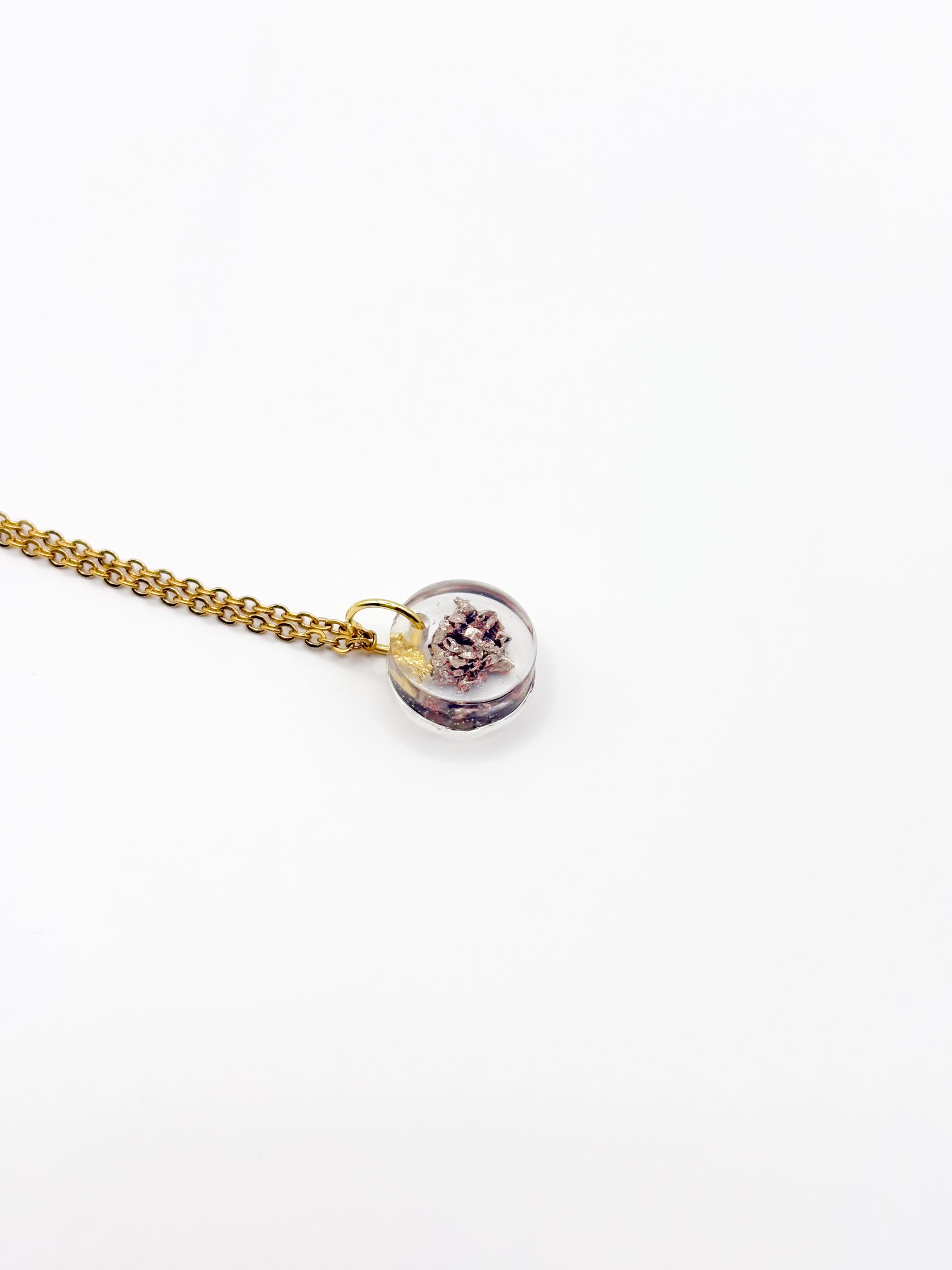 Elegant and eye-catching, The Final Chapter Circlet Necklace has a slightly larger circle pendant, where a preserved rose gold flower and delicate gold leaf rest inside crystal-clear resin. The pendant hangs from a fine gold chain, bringing warmth and luminosity to your neckline. It’s graceful yet bold, made for those who walk softly but leave a lasting impression.