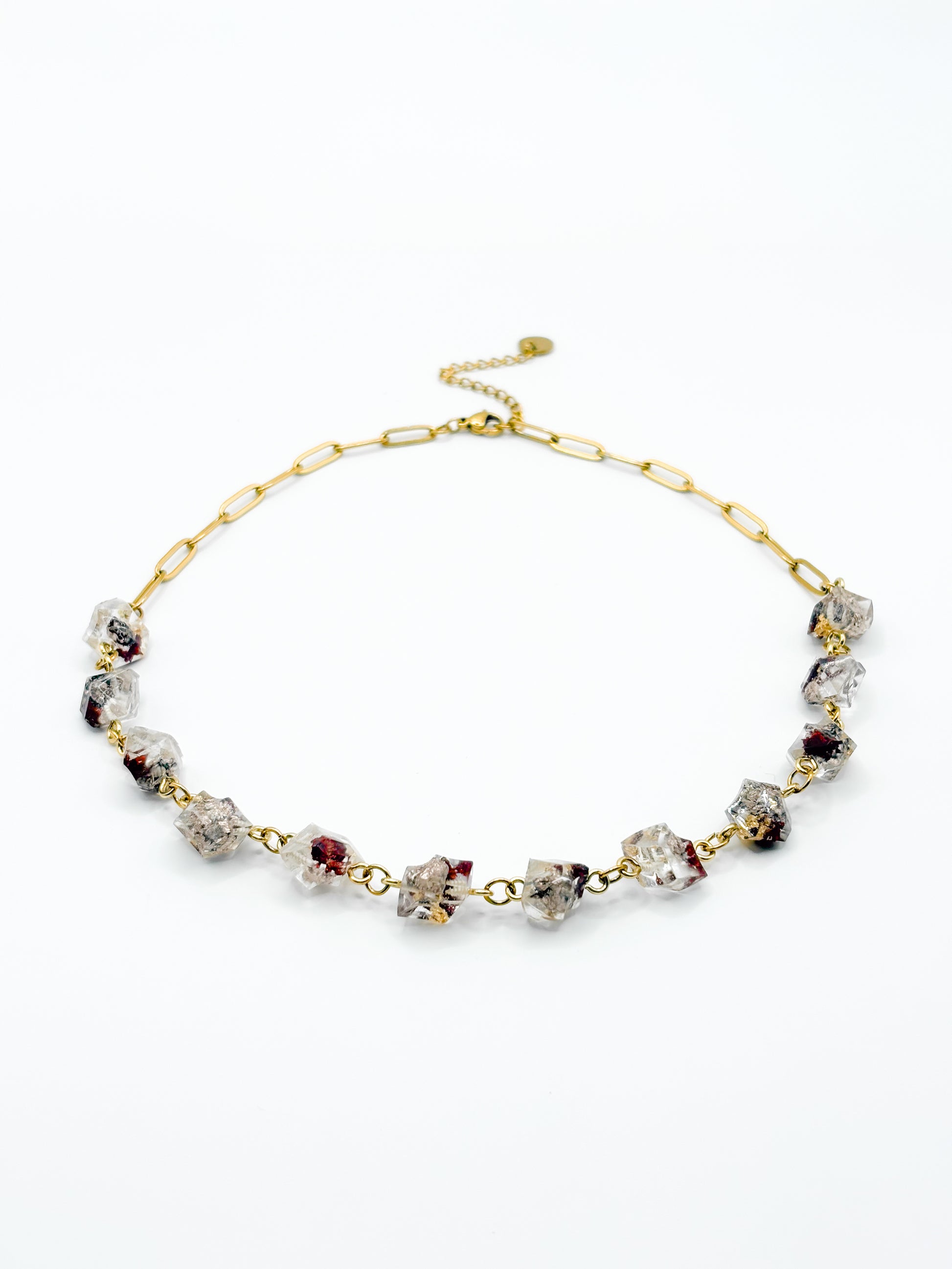 Radiant and unforgettable, The Final Chapter Crystal Necklace is crafted from a series of linked crystal-shaped pendants that shimmer across your neckline. Inside each angular form, real bordeaux and rose gold flowers from Scheveningen are preserved with hints of golden leaf. The necklace closes with a chunky gold chain that sits comfortably at the nape. This is wearable light and shadow, captured in a striking silhouette.