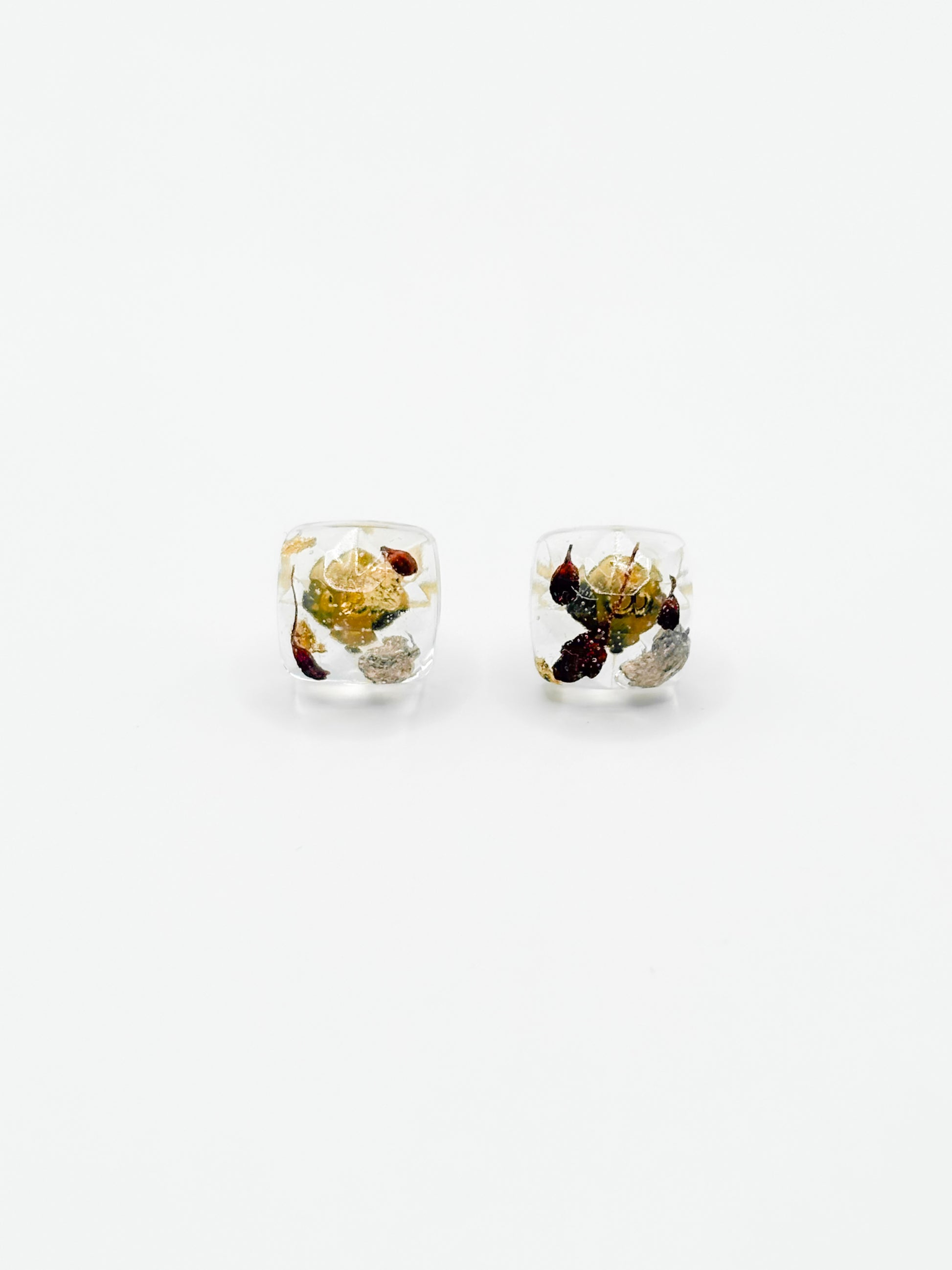 Clean and contemporary, The Final Chapter Square Stud Earrings feature bold, square-shaped resin studs with a polished, modern edge. Each square holds preserved rose gold and bordeaux flowers from Scheveningen with flecks of gold leaf that catch the light. With their minimalist geometry and natural depth, these earrings strike the perfect balance between structure and softness. A versatile design for everyday wear with just the right amount of impact.