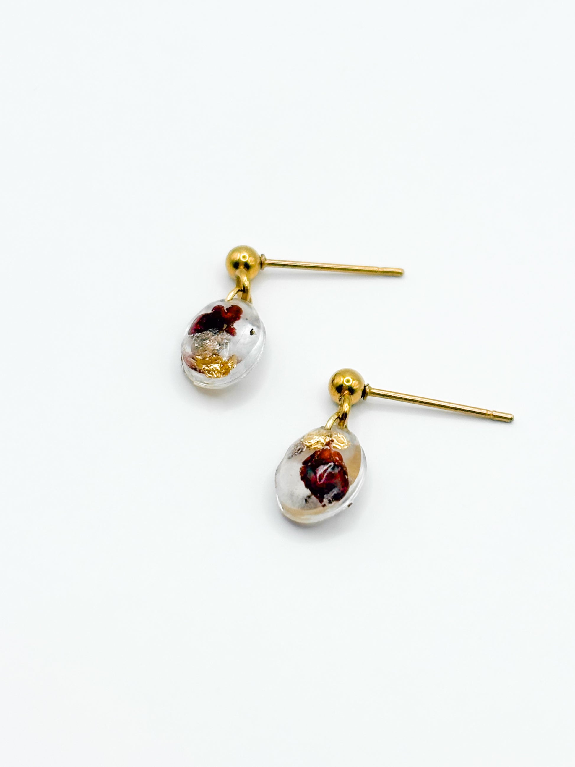 The Final Chapter Mini Oval Dangle Earrings are designed for daily wear. Tiny gold ball studs support small, oval-shaped resin pendants that move gently as you do. Each pendant holds a preserved flower from Scheveningen, softly accented with flecks of gold leaf. Lightweight and subtle, they add a polished, feminine touch to your everyday look. Simple, personal, and always beautiful.