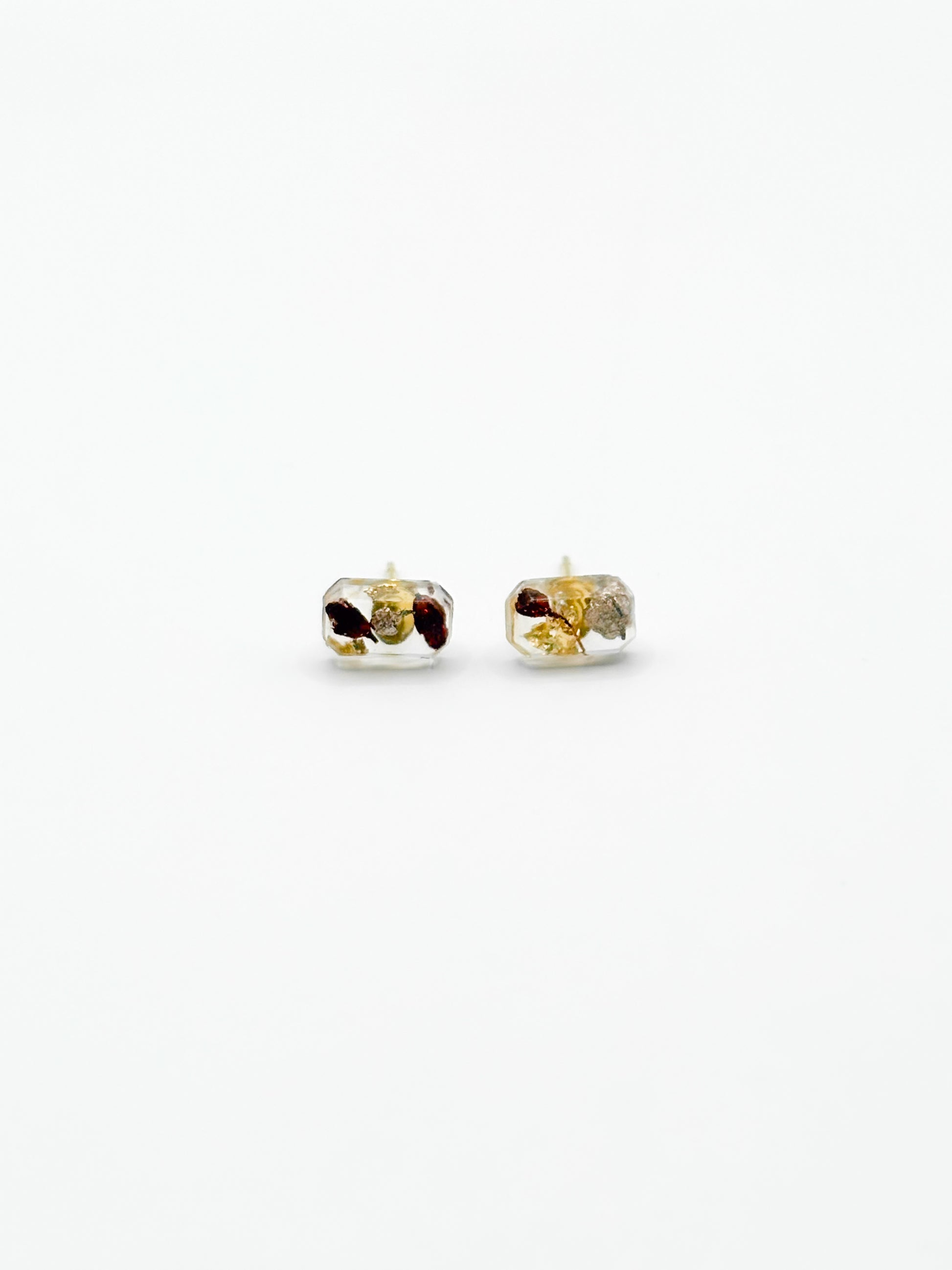 The Final Chapter Mini Emerald Cut Stud Earrings are designed for effortless everyday elegance. These small, emerald-cut resin studs feature clean, angular lines that add a touch of vintage charm. Inside each one is preserved rose gold and bordeaux flowers from Scheveningen floating in clear resin with a hint of gold leaf. Understated yet distinctive, they’re the kind of piece you’ll reach for again and again.